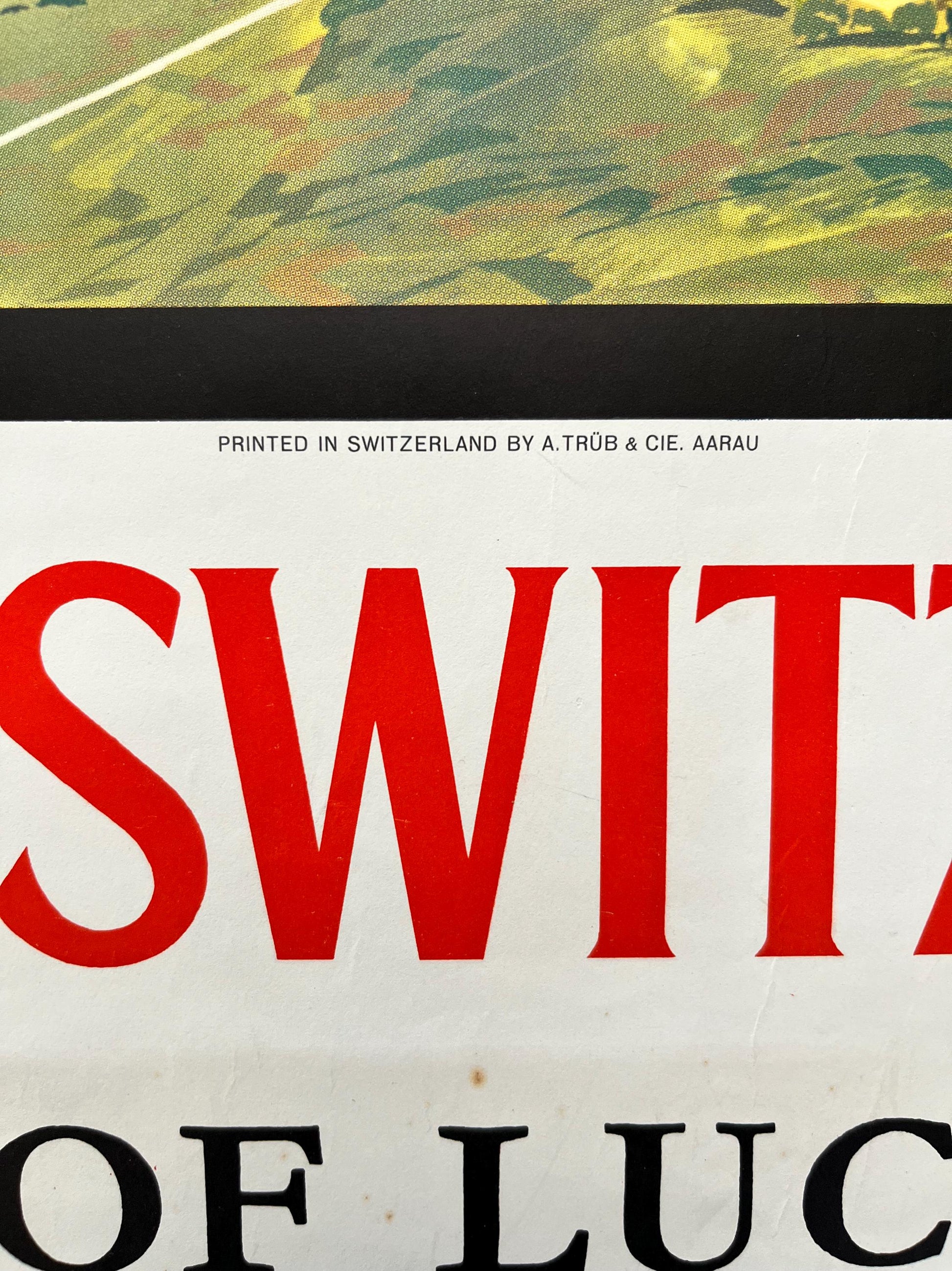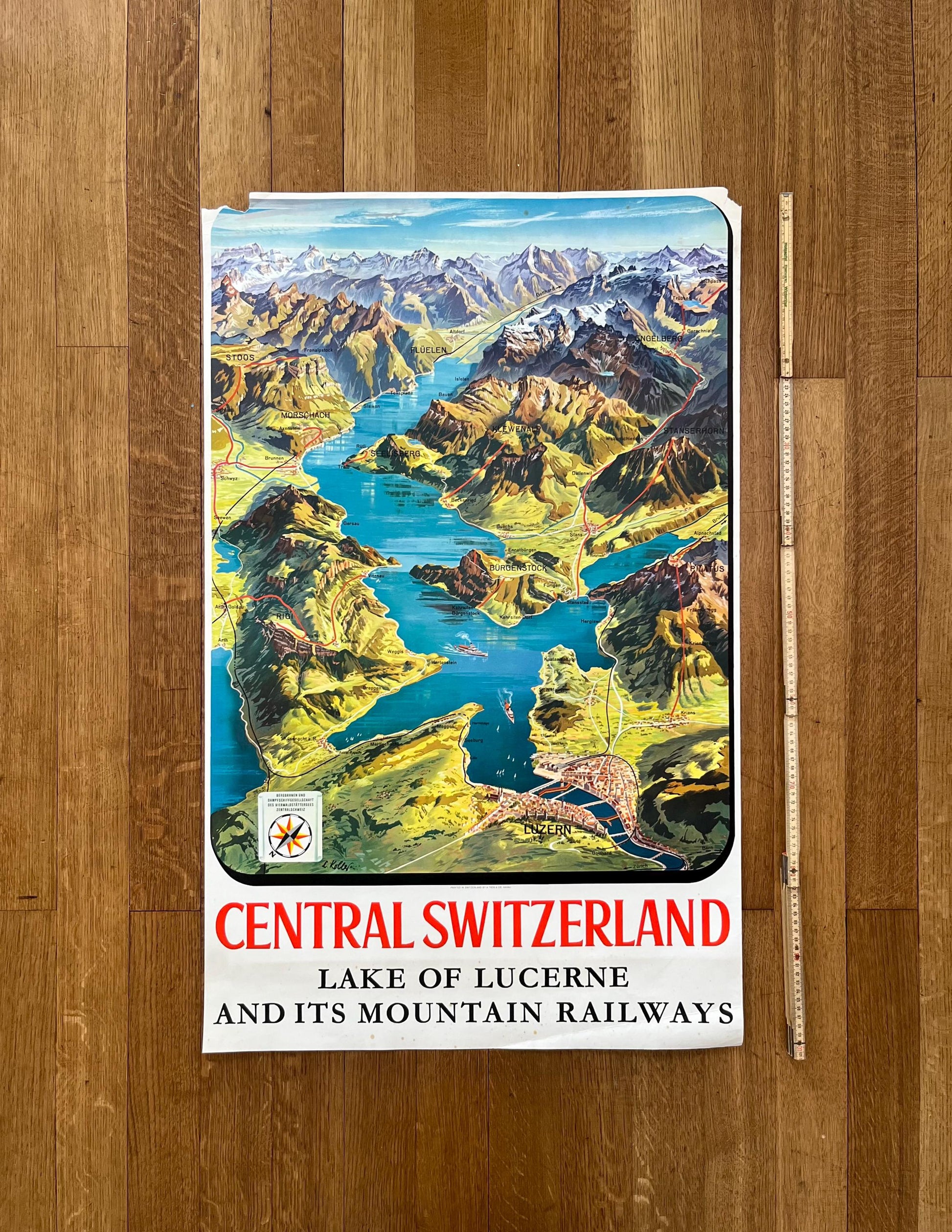 This is a beautiful poster featuring a work by Louis Koller showing a cartography of lucerne and its great mountains. It was made in 1965, Switzerland.