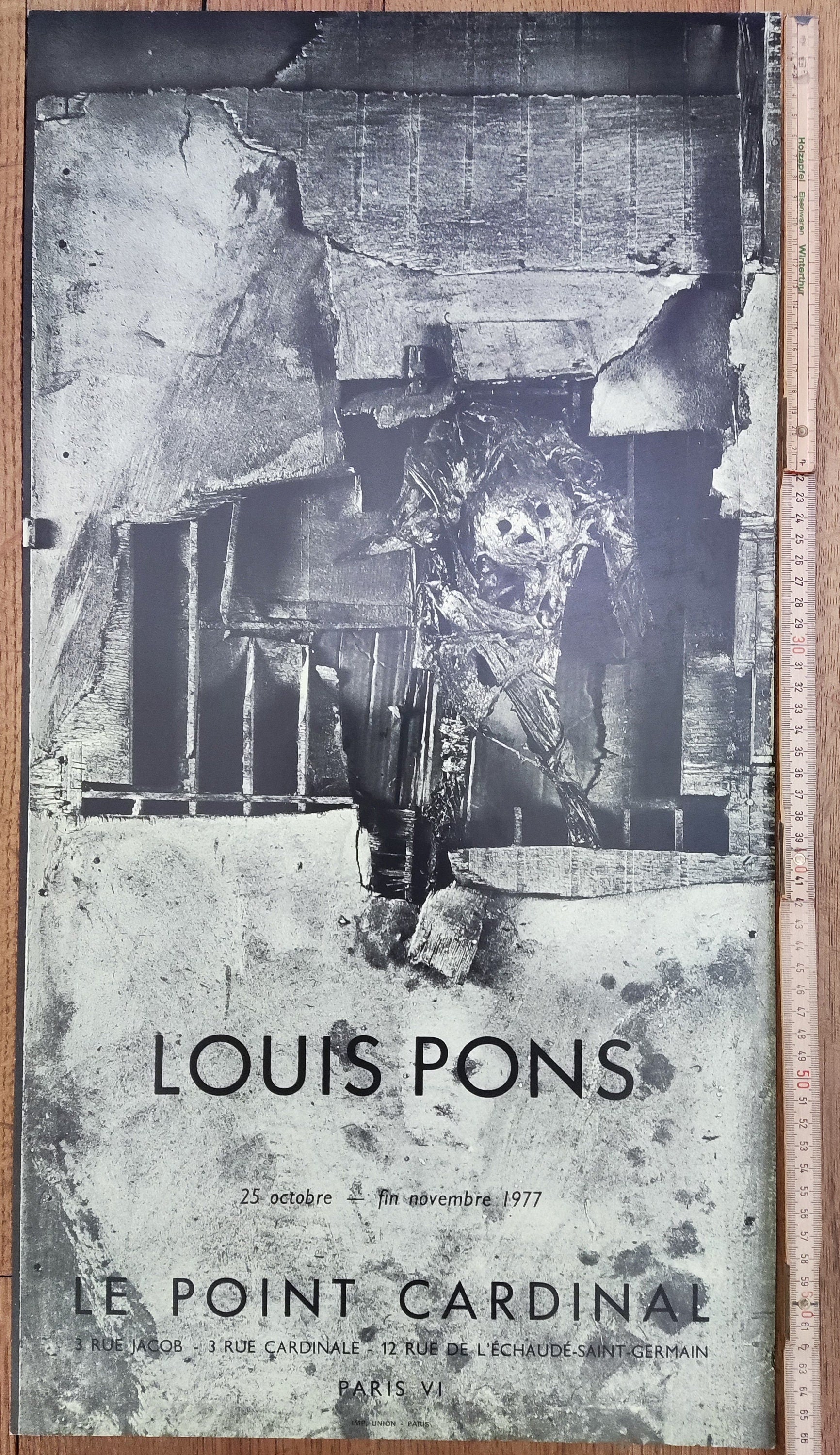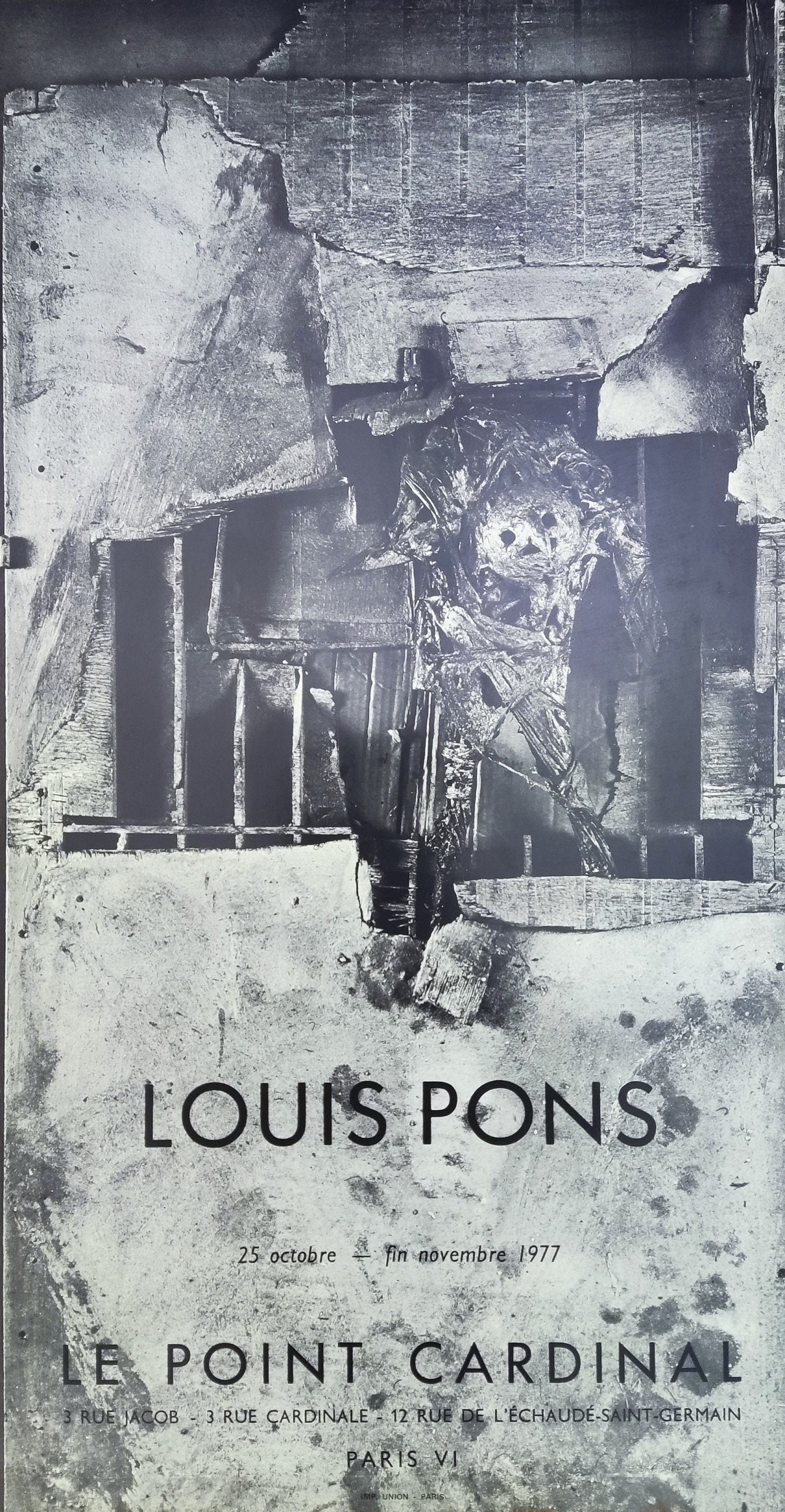 This is an original art exhibition poster by Louis Pons from an exhibition in Paris in 1977. Louis Pons (born 1927) is a French collage artist. He specializes in reliefs and assemblages made entirely from discarded objects and junk.