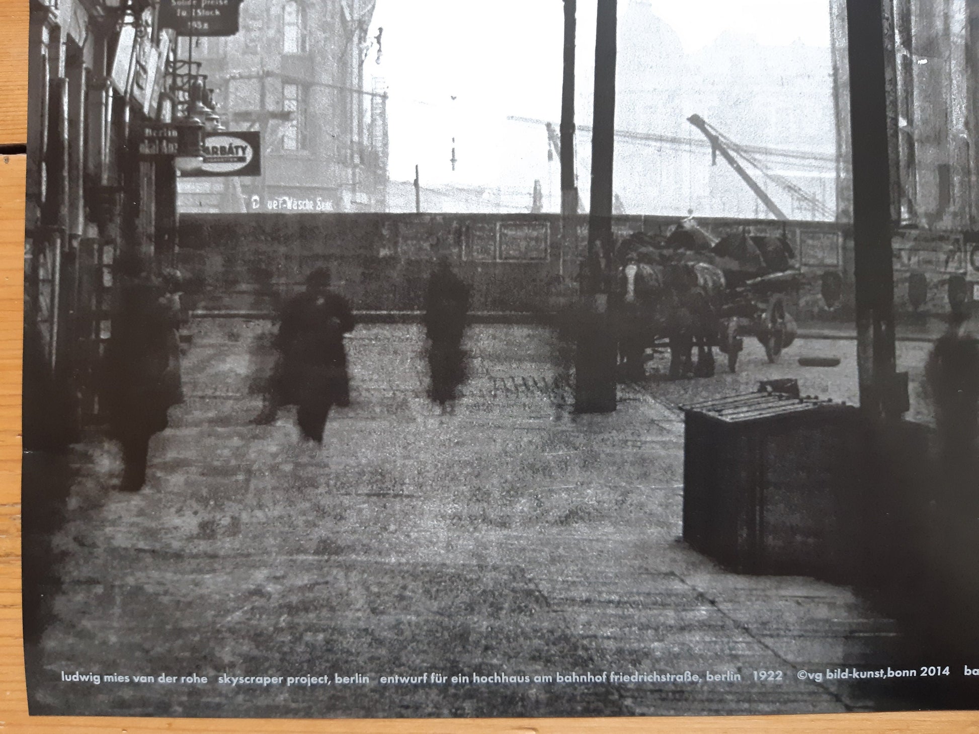 This is an art poster, published by the Bauhaus Archiv in Berlin, featuring the famous futuristic study of the skyscraper project at Bahnhof Friedrichstrasse in Berlin in 1922.