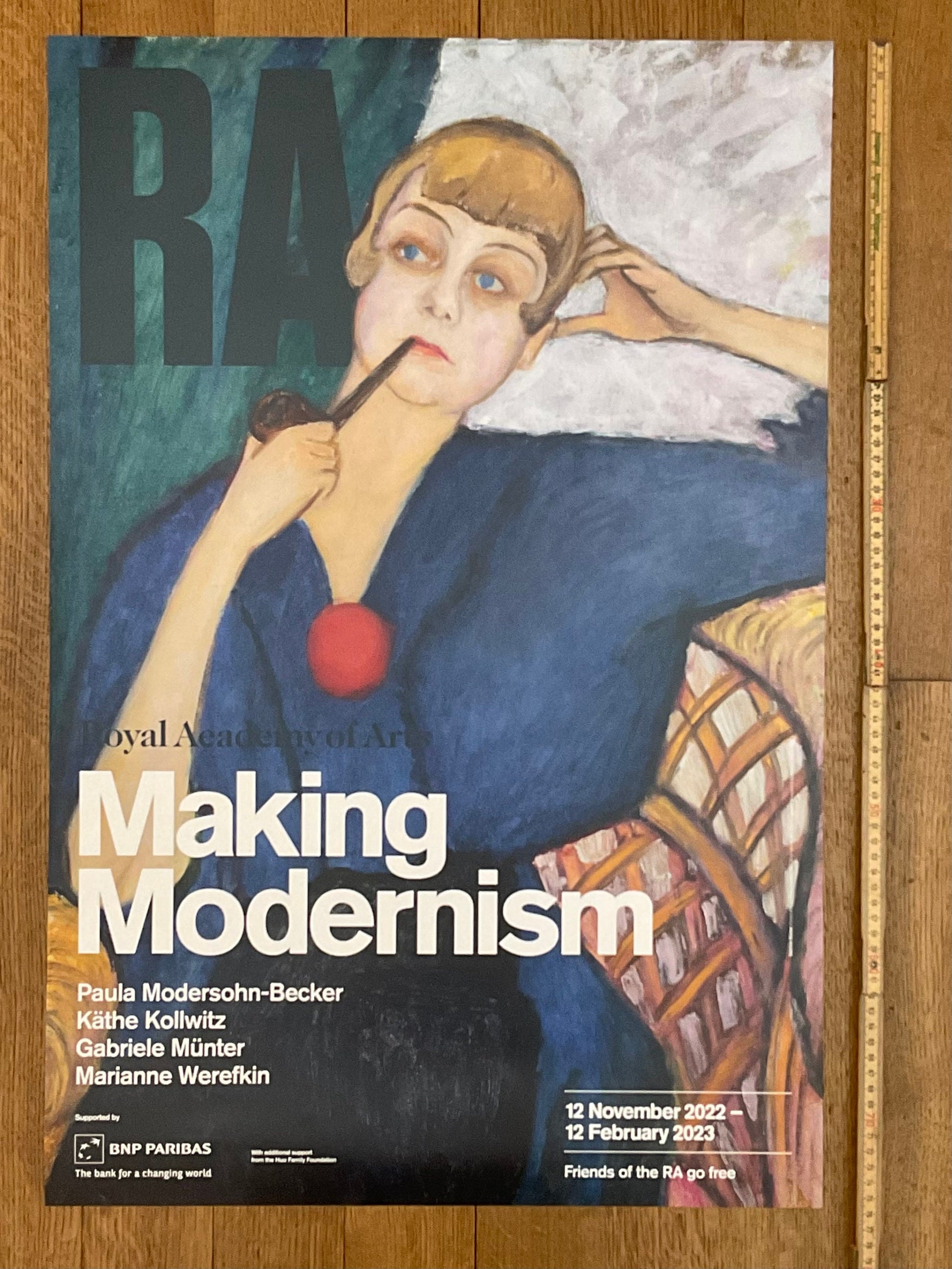 This original art poster was released by the Royal Academy of Arts in London for an exhibition called "Modern Modernism". The exhibition features Paula Modernsohn-Becker, Käthe Kollwitz, Gabriele Münter and Marianne Werefkin. The poster features Gabriele Münter's expressive Portrait of Anna Roslund.