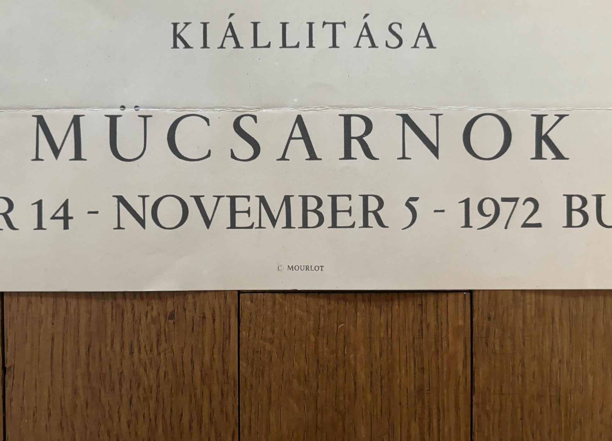 This is a beautiful silkscreen-lithography art poster by the famous Marc Chagall featuring an artwork with an abstract Eiffel Tower and a bird. The poster advertises an exhibition at the Műcsarnok-museum in Budapest in 1972.