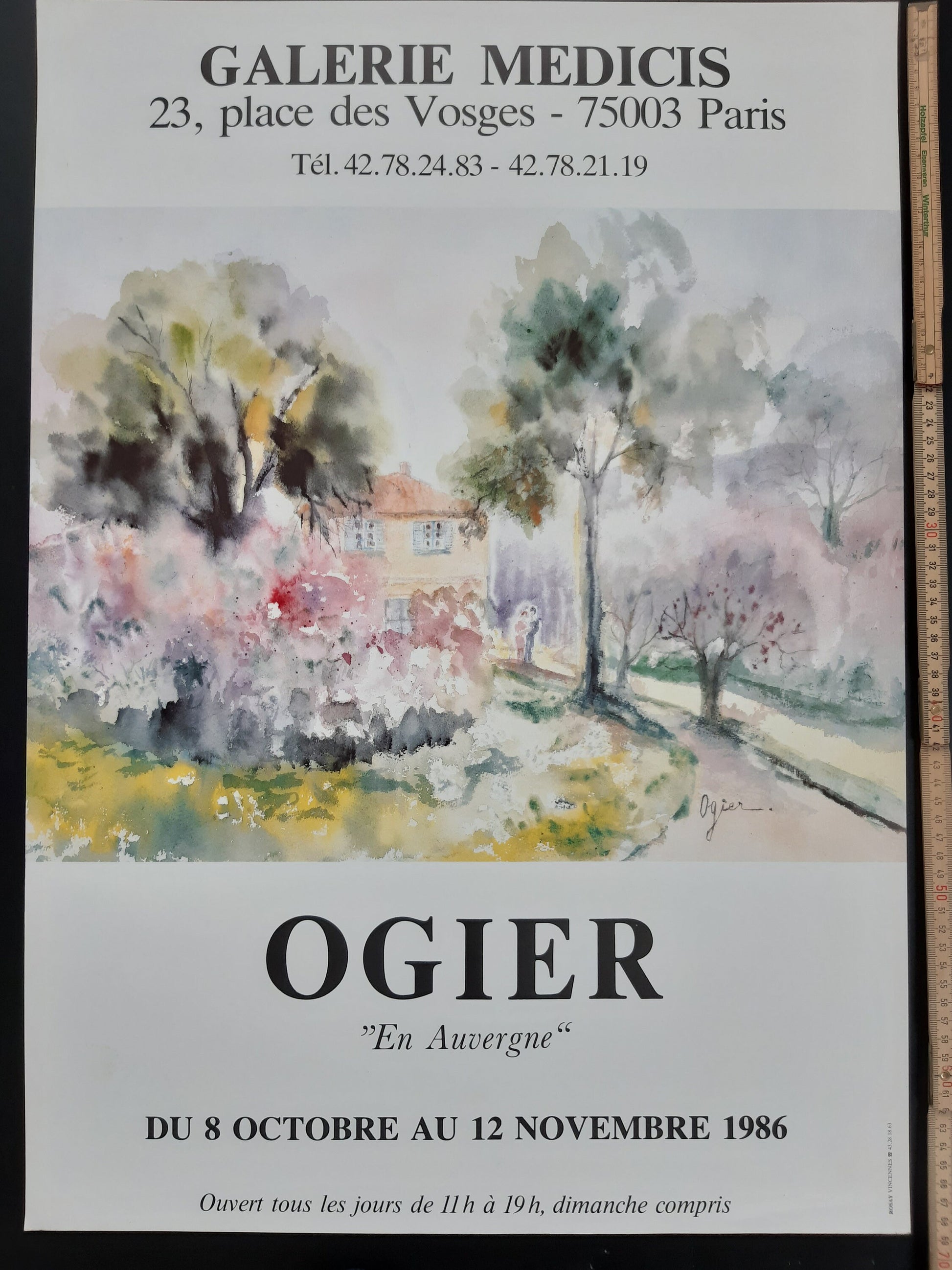 This is an art poster released for an exhibition at the Galerie Medicis in Paris, France in 1986, featuring an aquarelle painted by Marie-Louise Ogier, a french female painter.