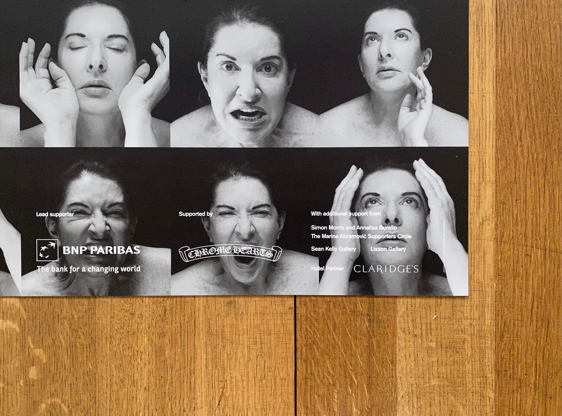 This is an original photography poster by Serbian Marina Abramović featuring portraits of women doing weird facial expressions and advertising an exhibition at the Royal Academy of Arts in 2023.