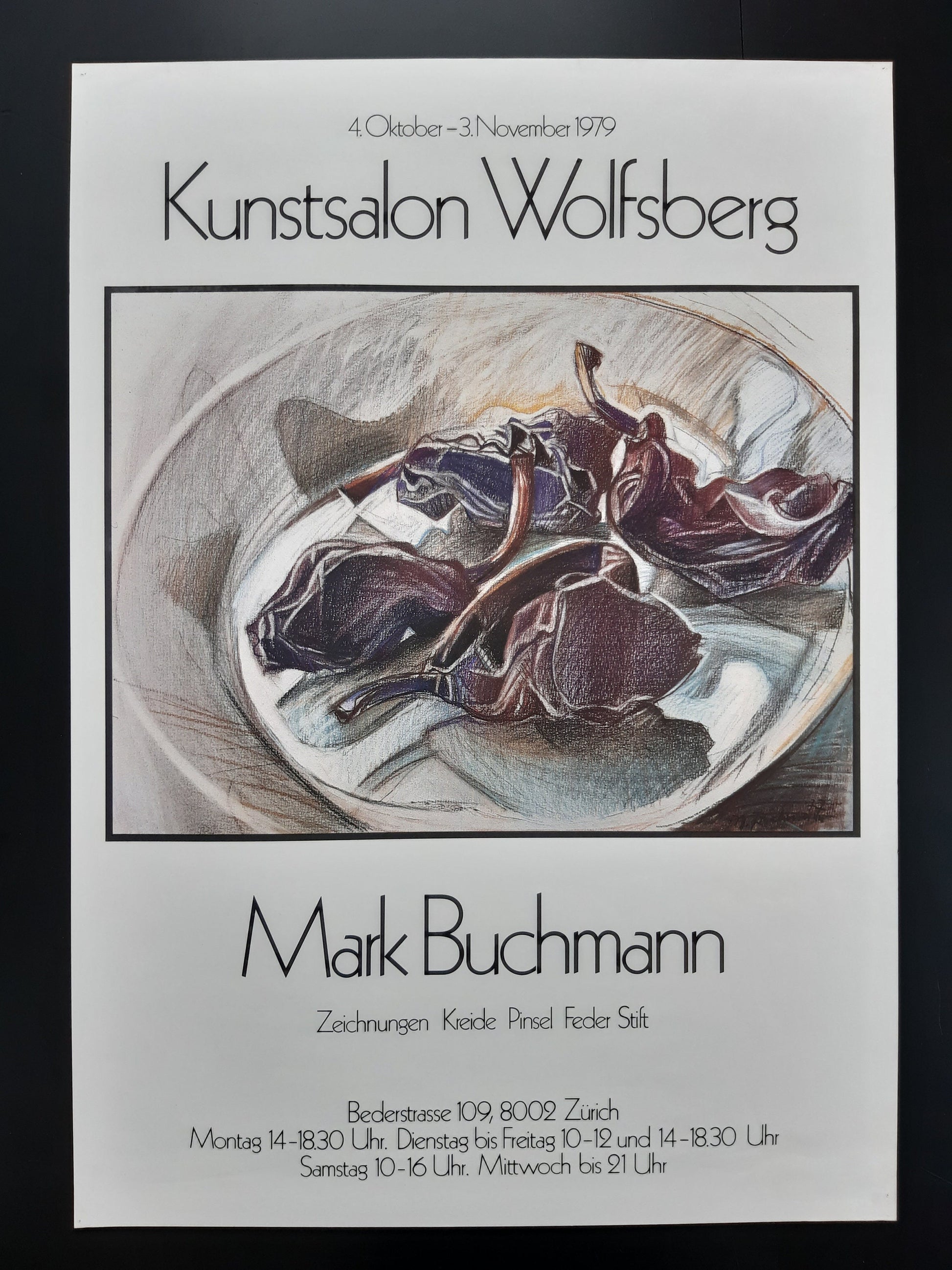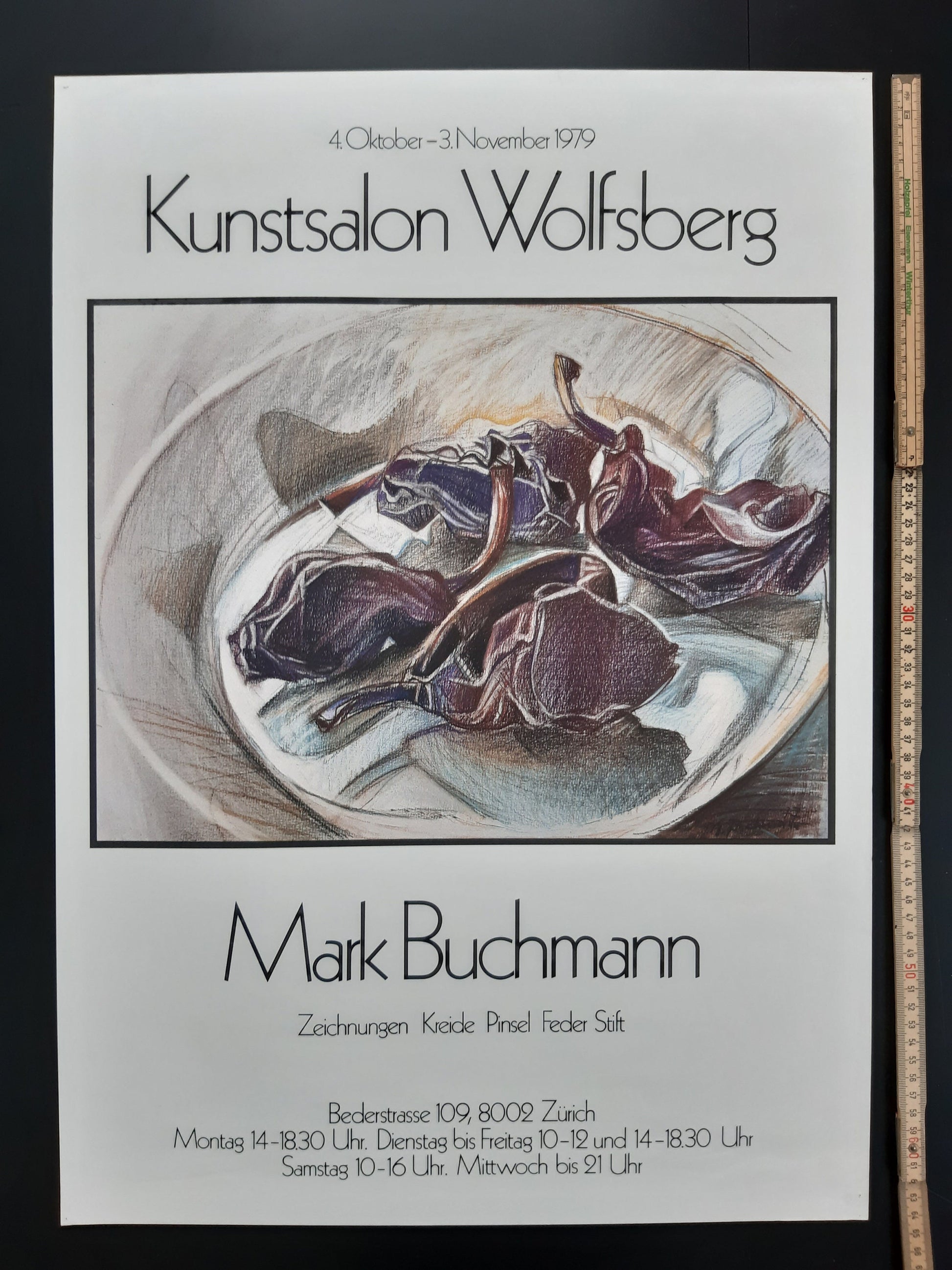 This is an original art exhibition poster advertising an exhibition in Zurich, Switzerland, at the famous Kunstsalon Wolfsberg in 1979.
