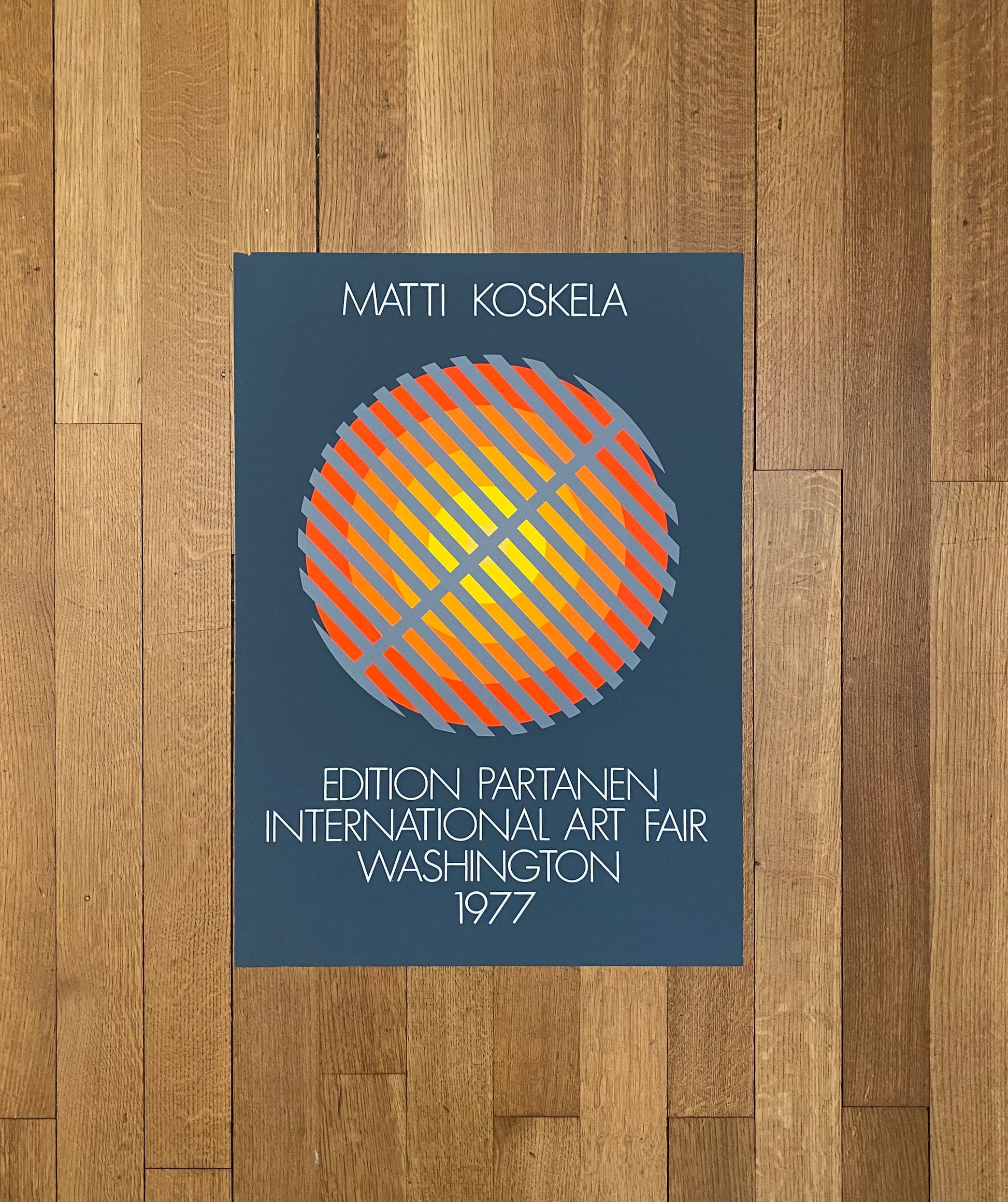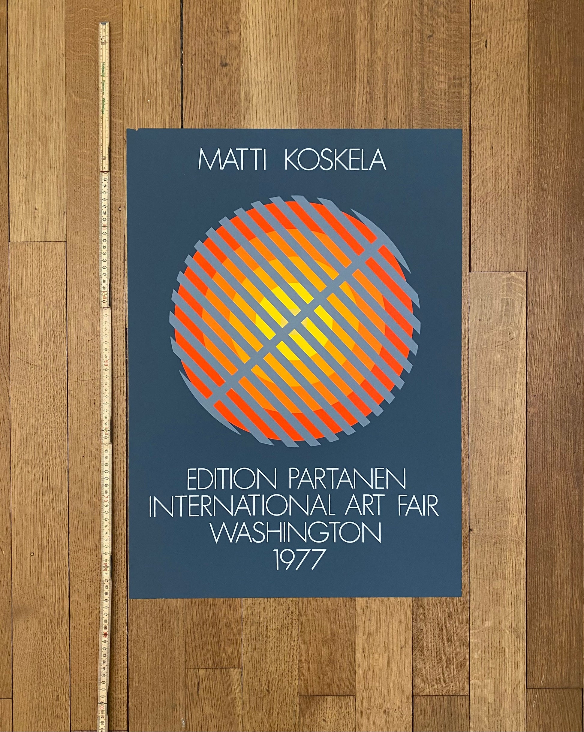 This is a beautiful silkscreen-lithography art poster by Finnish Matti Koskela featuring a colorful artwork with geometric shapes and advertising the International Art Fair in Washington in 1977.