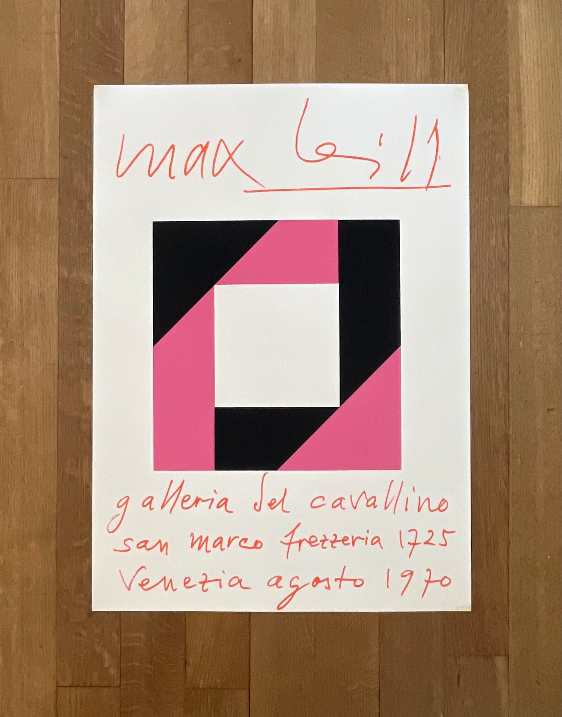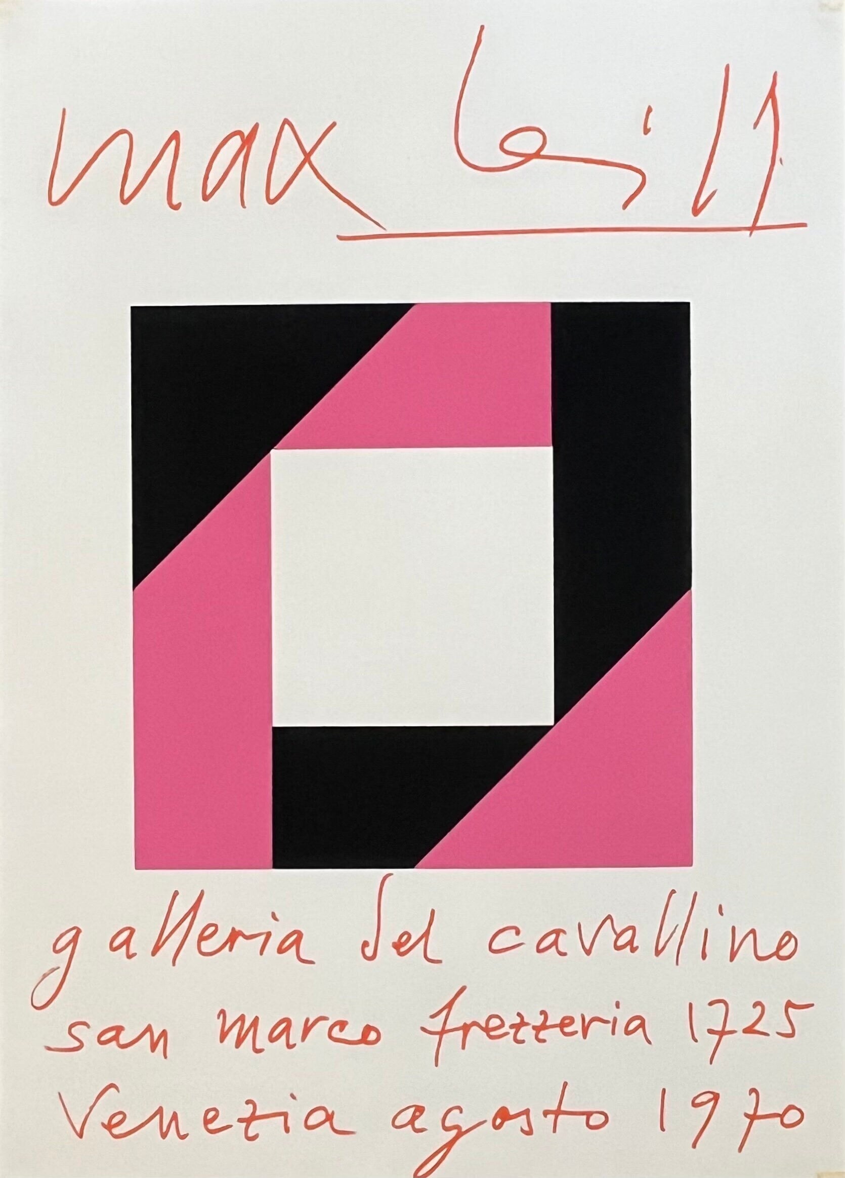 This is an original silkscreen-lithography art poster by Swiss Max Bill featuring a black and pink artwork and advertising an exhibition at the gallerie del cavallino in Italy.