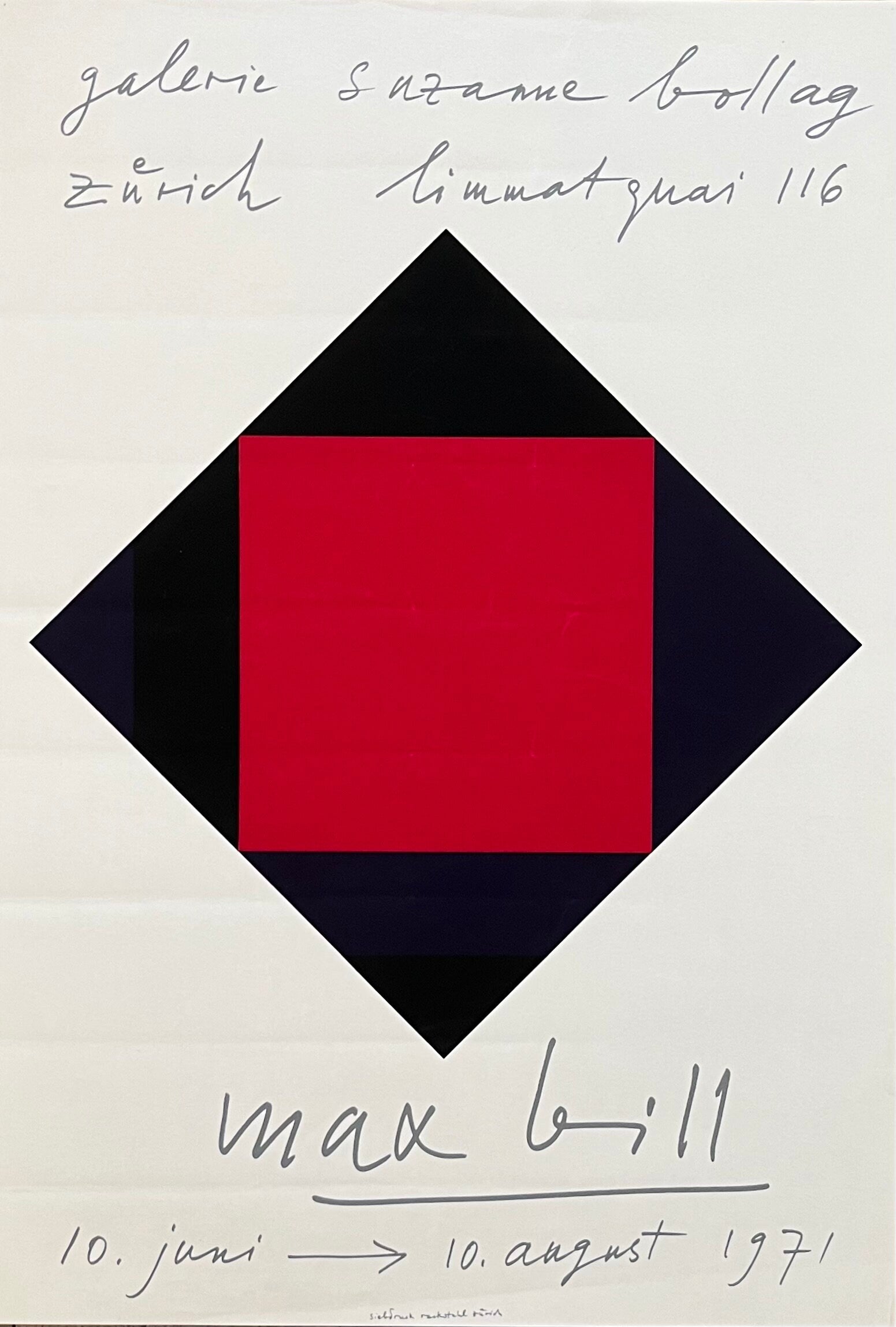 This is a beautiful silkscreen-lithography art poster by Swiss Max Bill featuring a black & red abstract artwork and advertising an exhibition in Zurich, Switzerland in 1971.