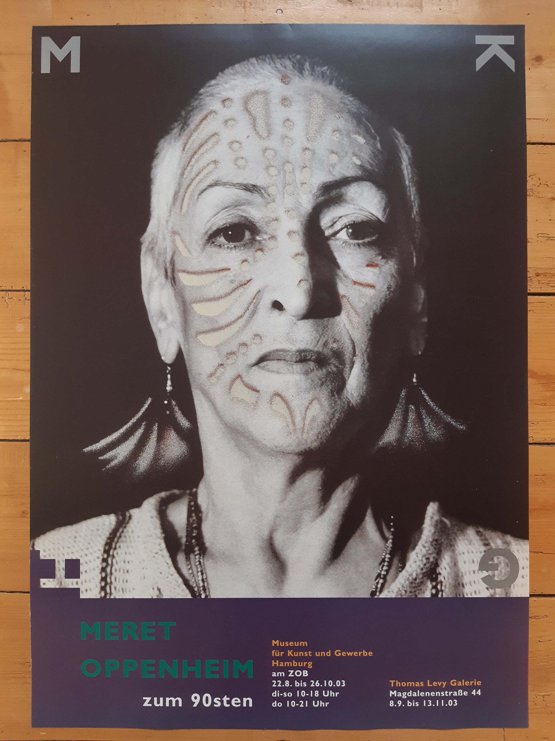 This original poster has been designed for an exhibition in 2003 in Germany. It features the artwork "Portrait mit Tätowierung", a portrait photo of the artist (taken 1978 by Heinz Günther Mebusch, Düsseldorf), with some "decoration" added with spray by the artist herself in 1980.