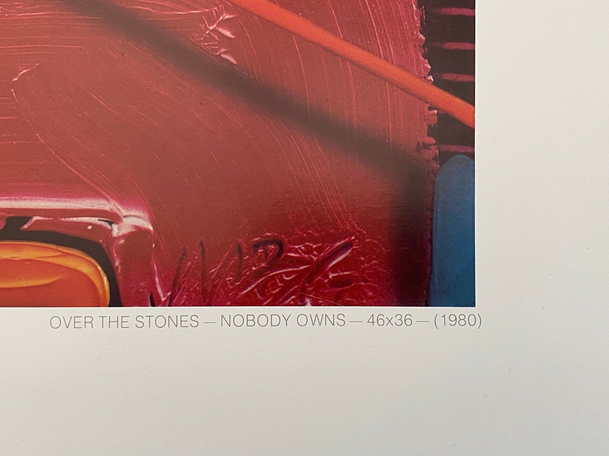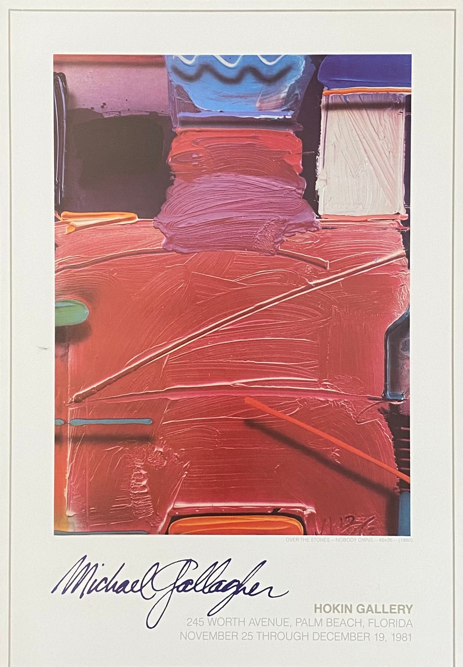 This is an original art poster featuring a photographic art work by Michael Gallagher. The name of this poster is "Above the Stones" and shows various reddish colours. It was publsihed for an exhibiton at the Hokin Gallery in Palm Beach, Florida USA (1981).