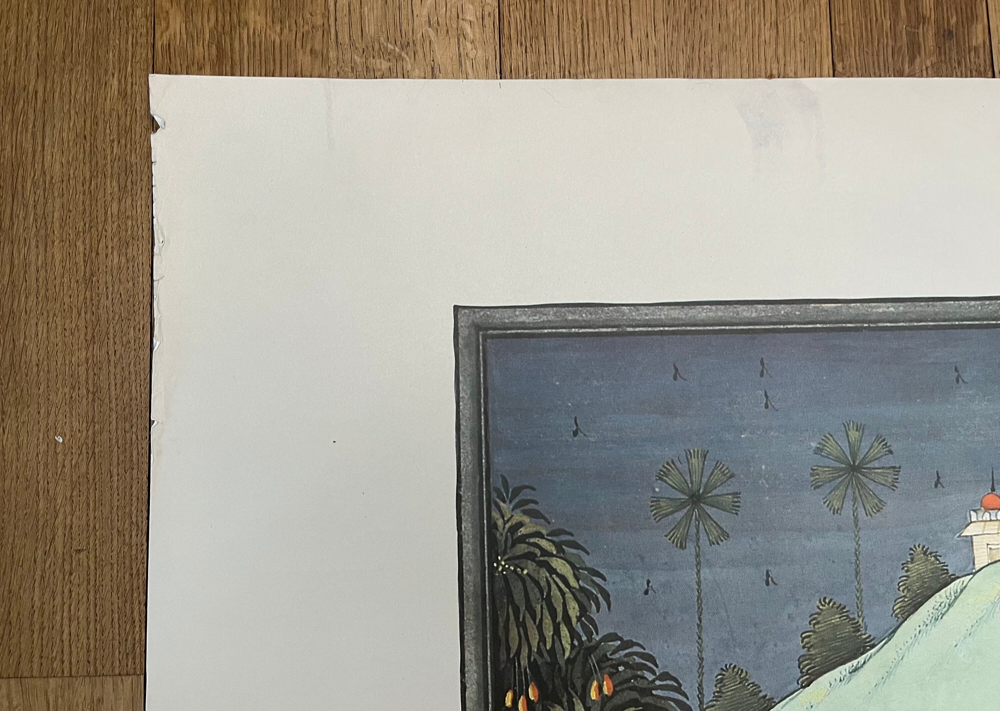 The poster is in used condition with tears at the right border bottom (7.5;8;9.5 cm), some rough signs of handling along borders, a few stains at the border area, light yellowing, and small folds at the corners. It is still beautiful and the flaws give it a vintage charm.
