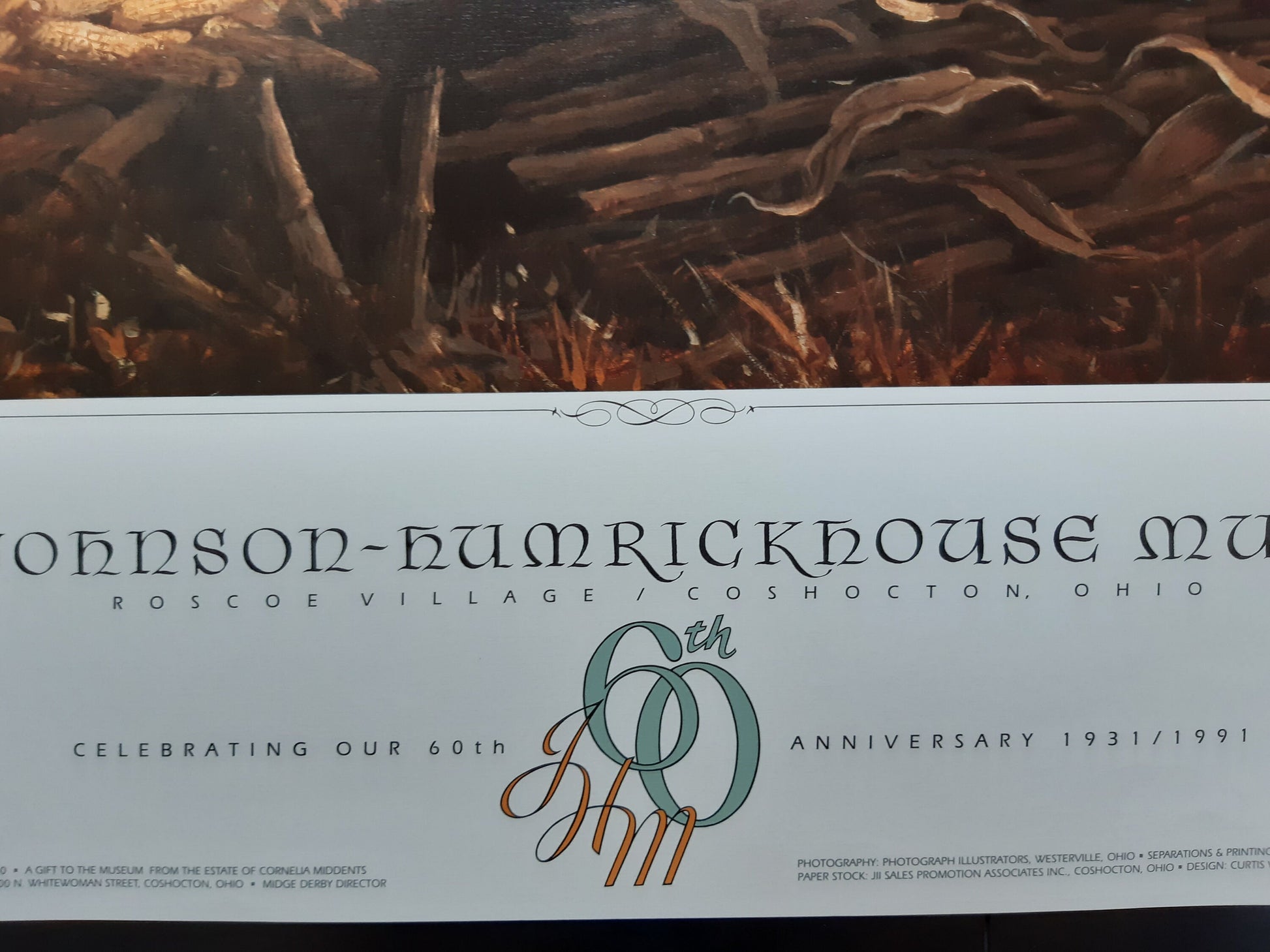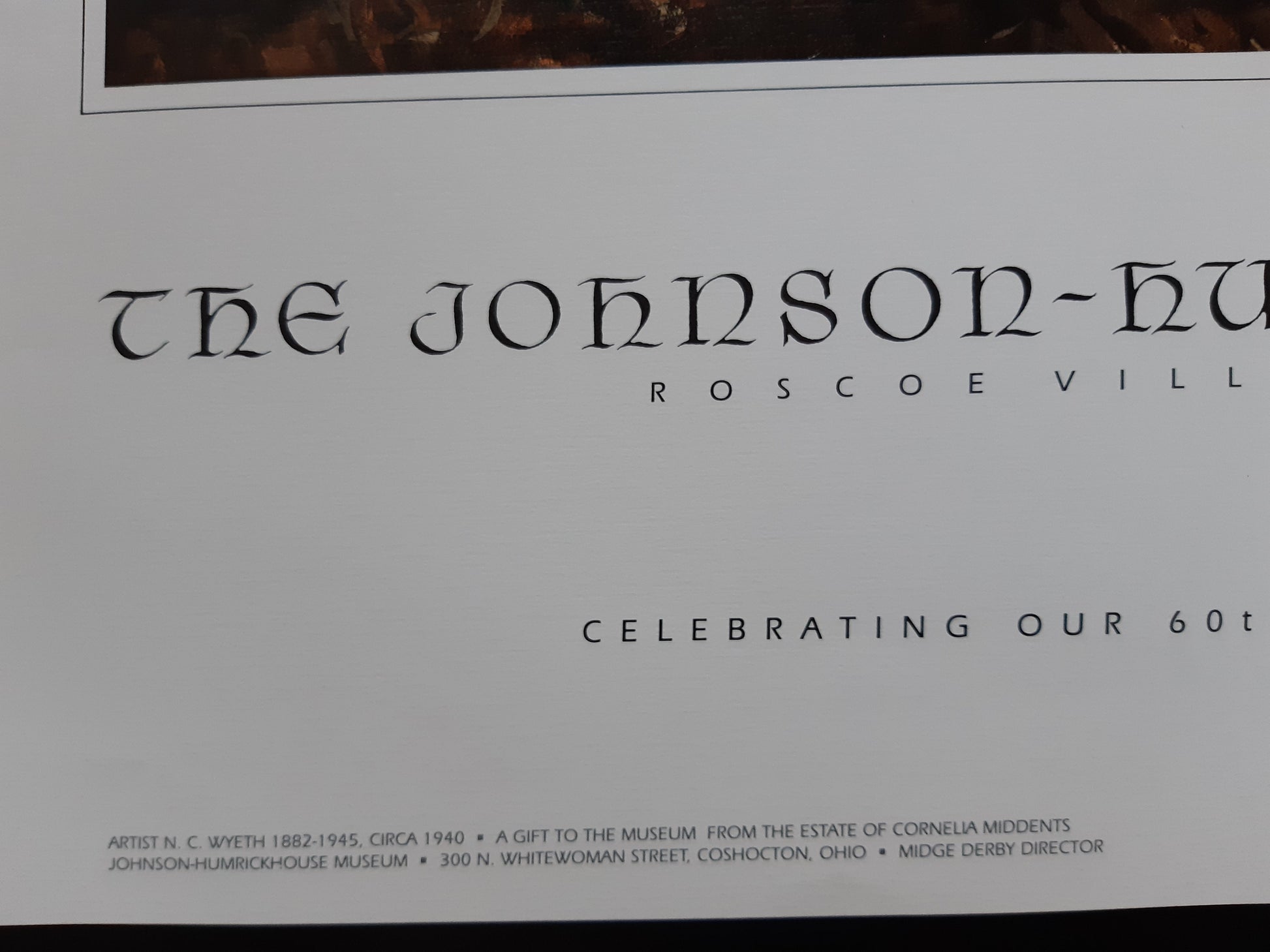 This is an original art exhibition poster, featuring a painting by N. C. Wyeth. It has been produced by the by the Johnson-Humrickhouse Museum to celebrate the 60th anniversary in 1991.