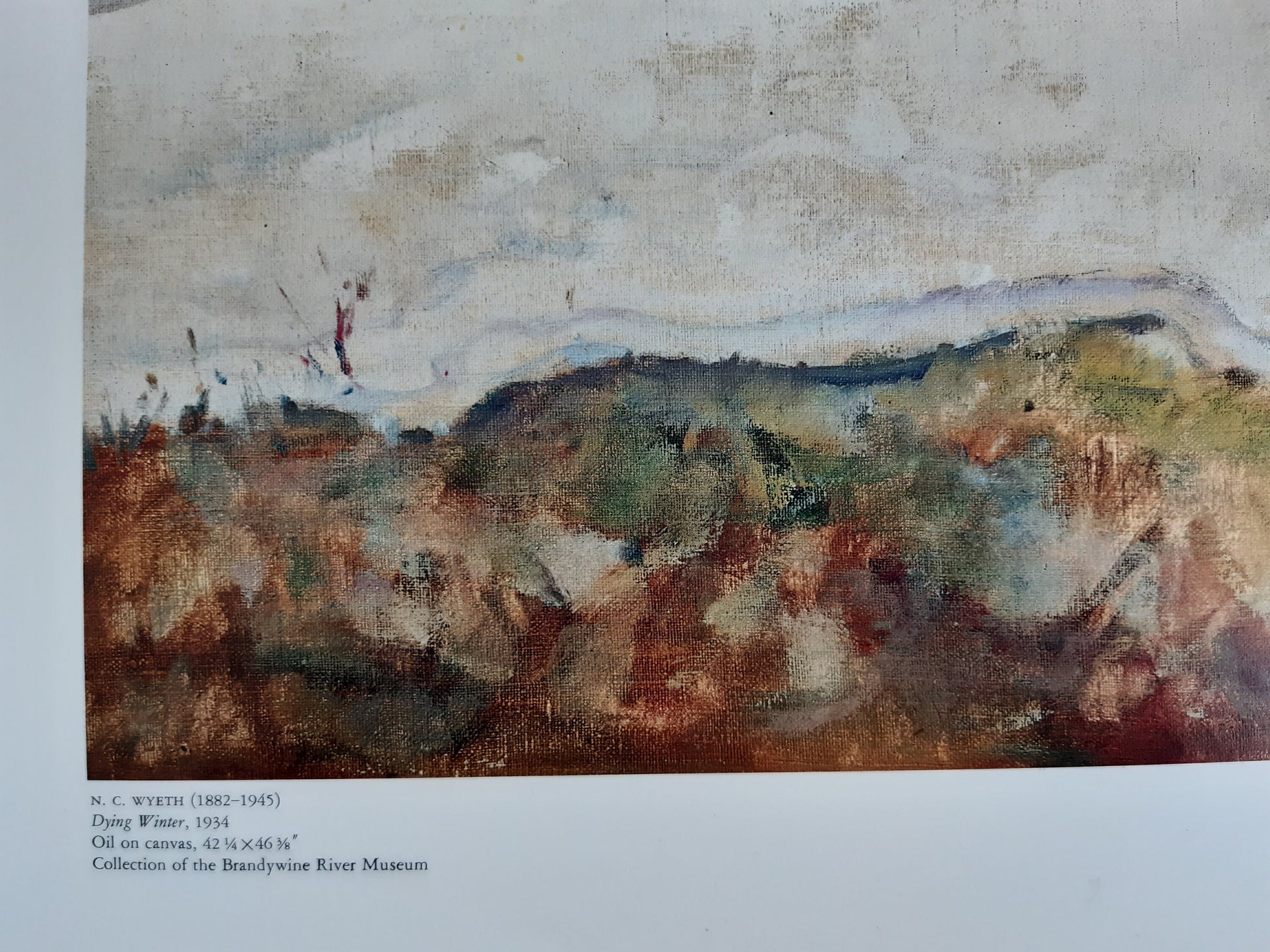 This is an original art exhibition poster, featuring a painting by N. C. Wyeth called "Dying Winter", 1934.