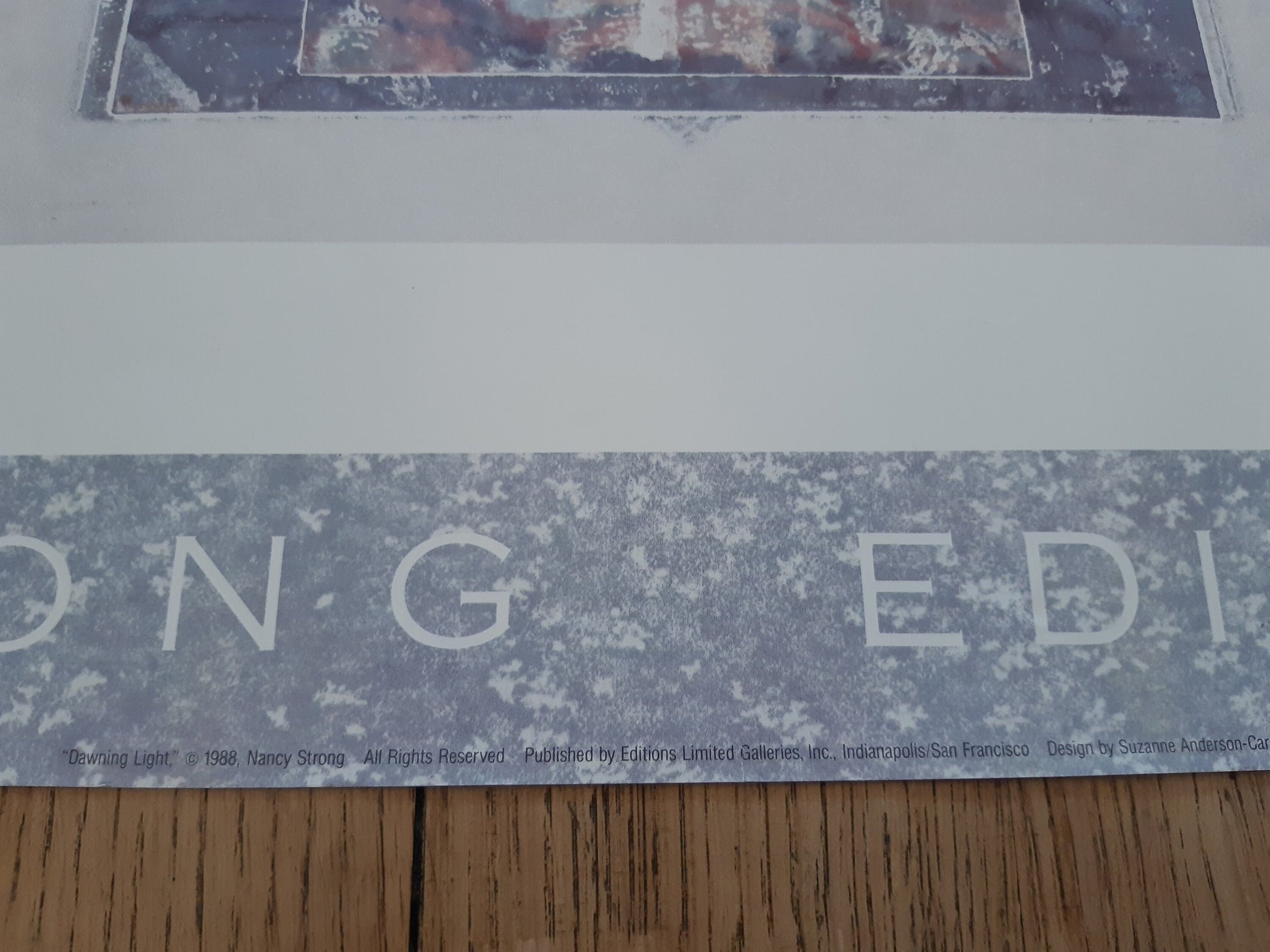 This is an original art print featuring the artwork "dawning light" of Nancy Strong (American, born 1953). It has been printed in 1988 and is in good condition. Notable only a little tear at the top, hardly visible if framed.