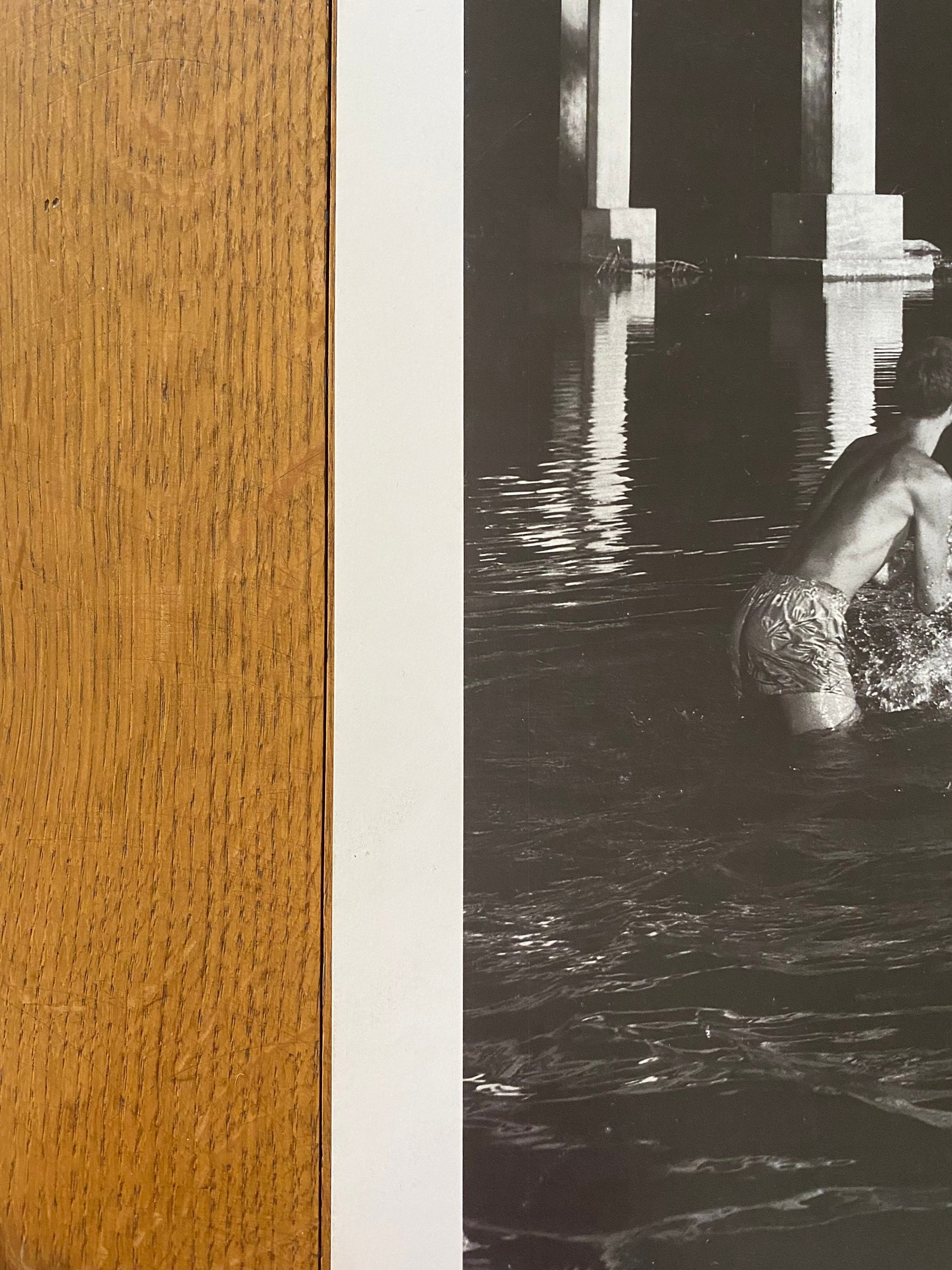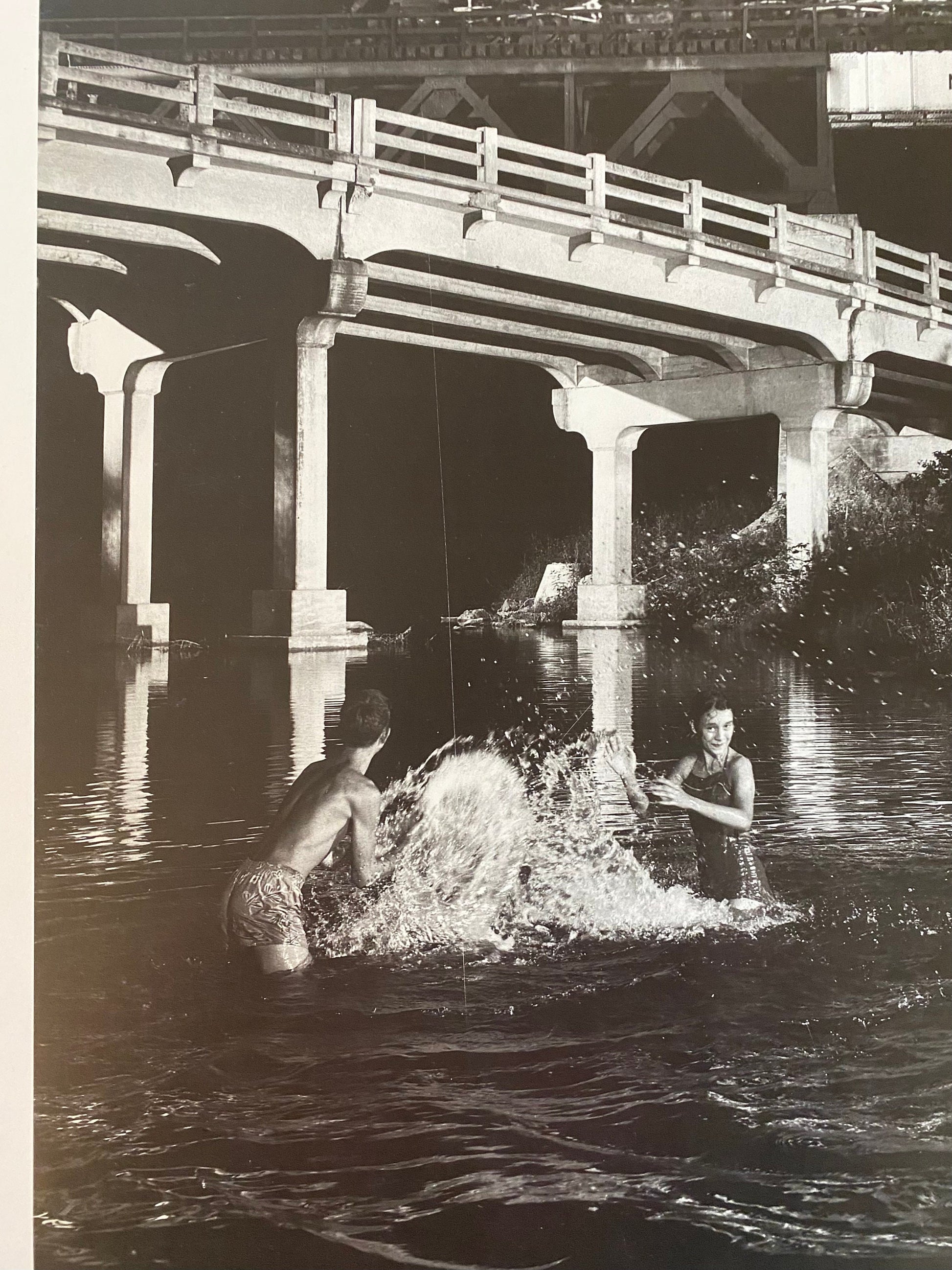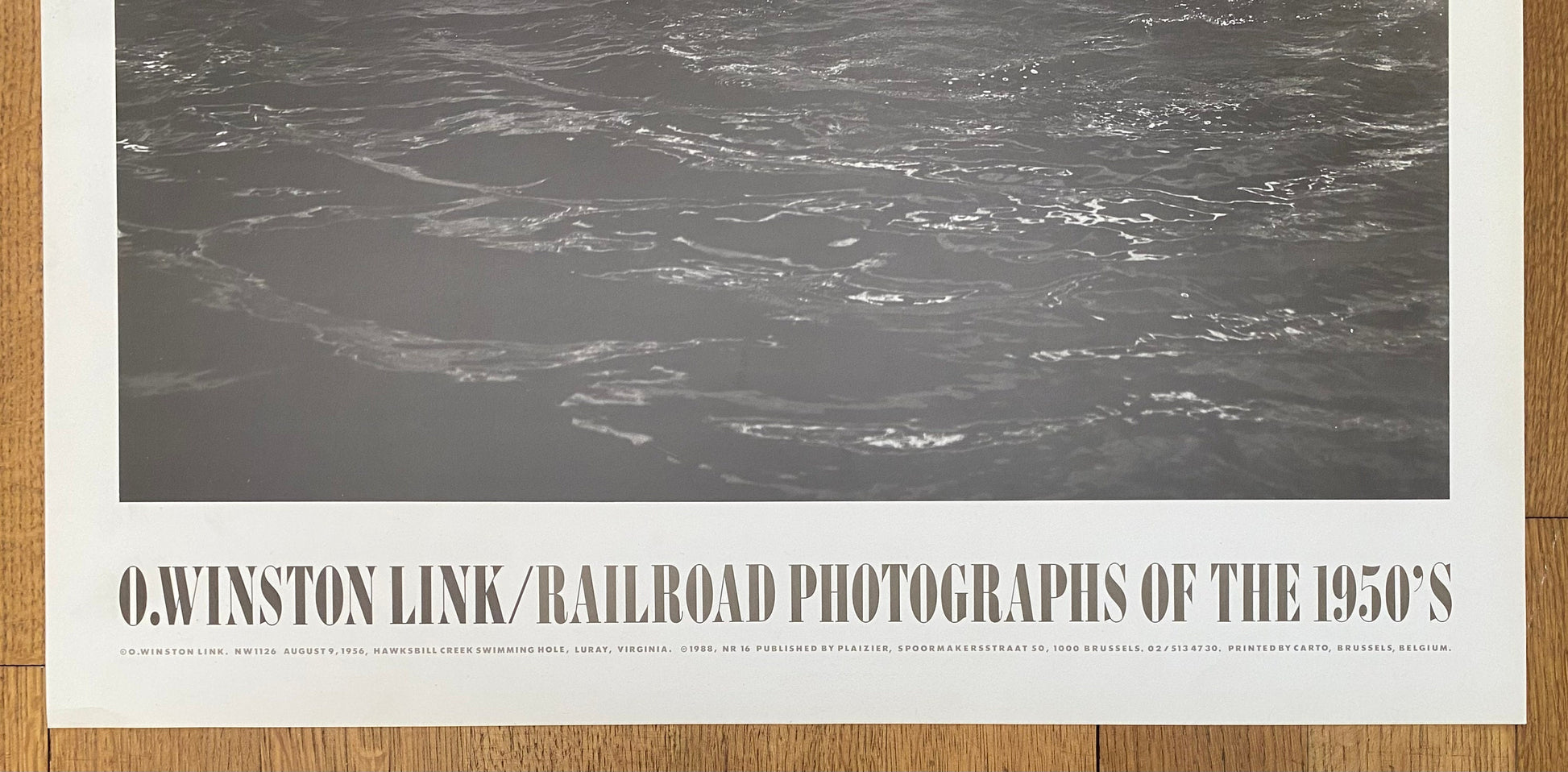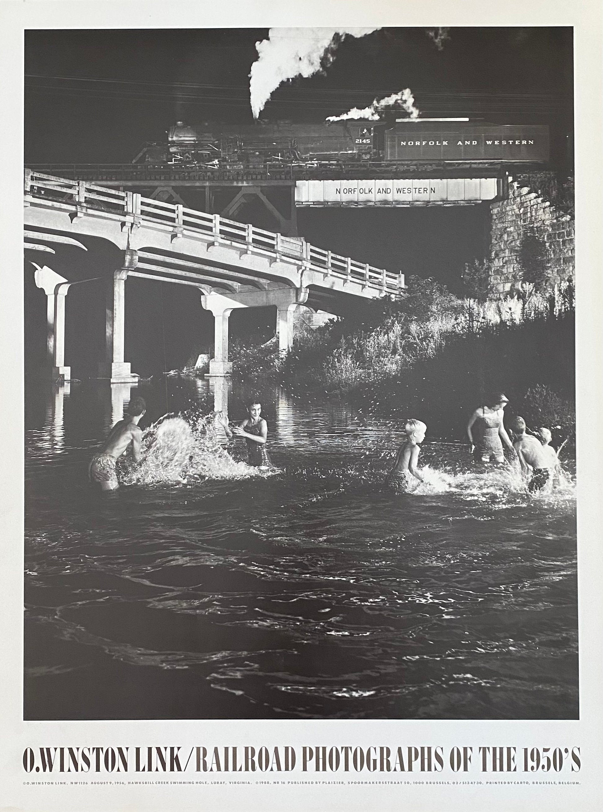 This is an original photography poster by Ogle Winston Link featuring an artwork of children playing in a river infront of a railway and advertising his book "Ghost Trains: Railroad Photographs of the 1950's".