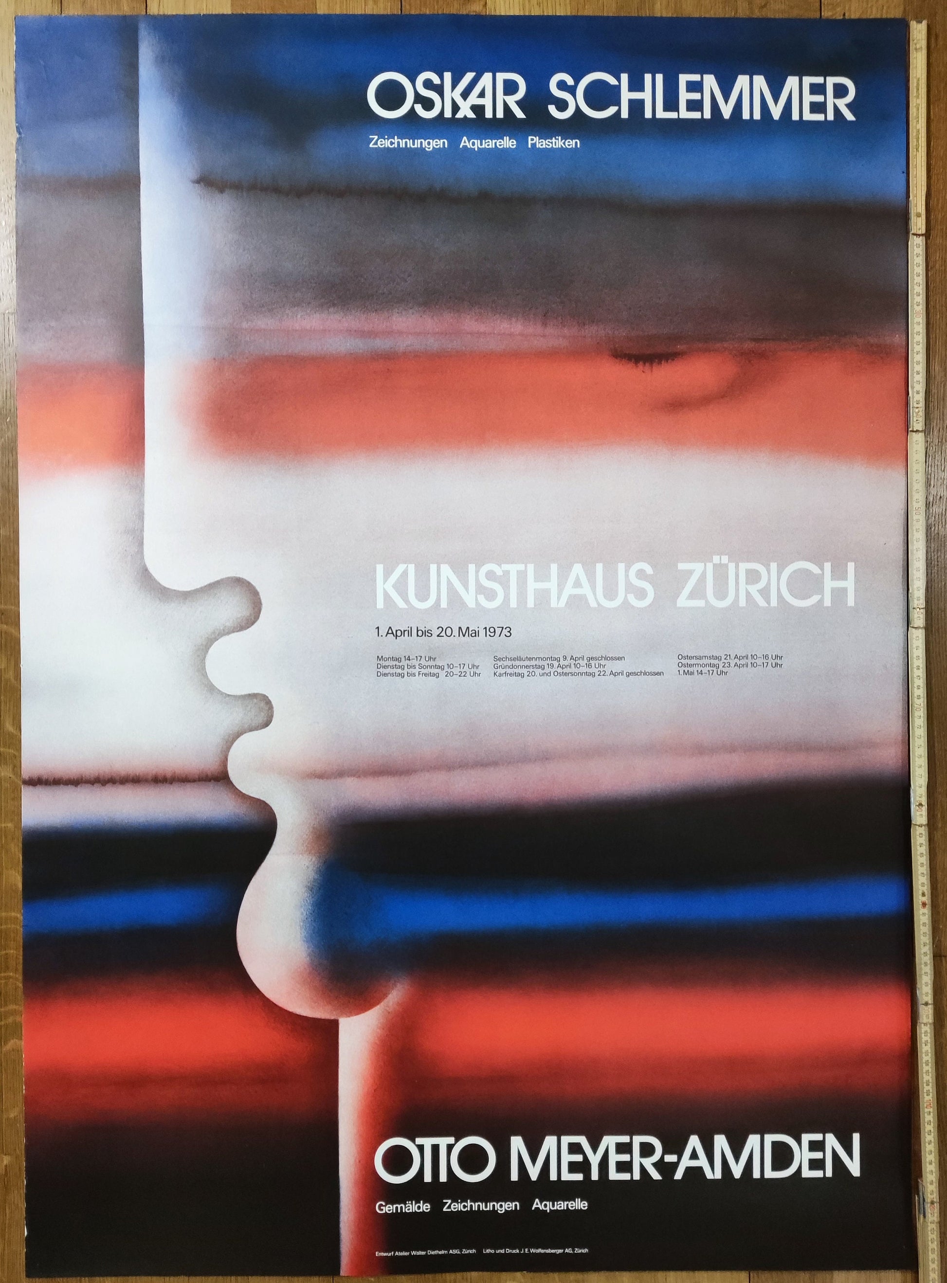 This is an original art exhibition poster featuring an artwork with colorful abstract stripes and advertising an exhibition of Oskar Schlemmer and Otto Meyer-Amden at the Kunsthaus Zurich in 1973.