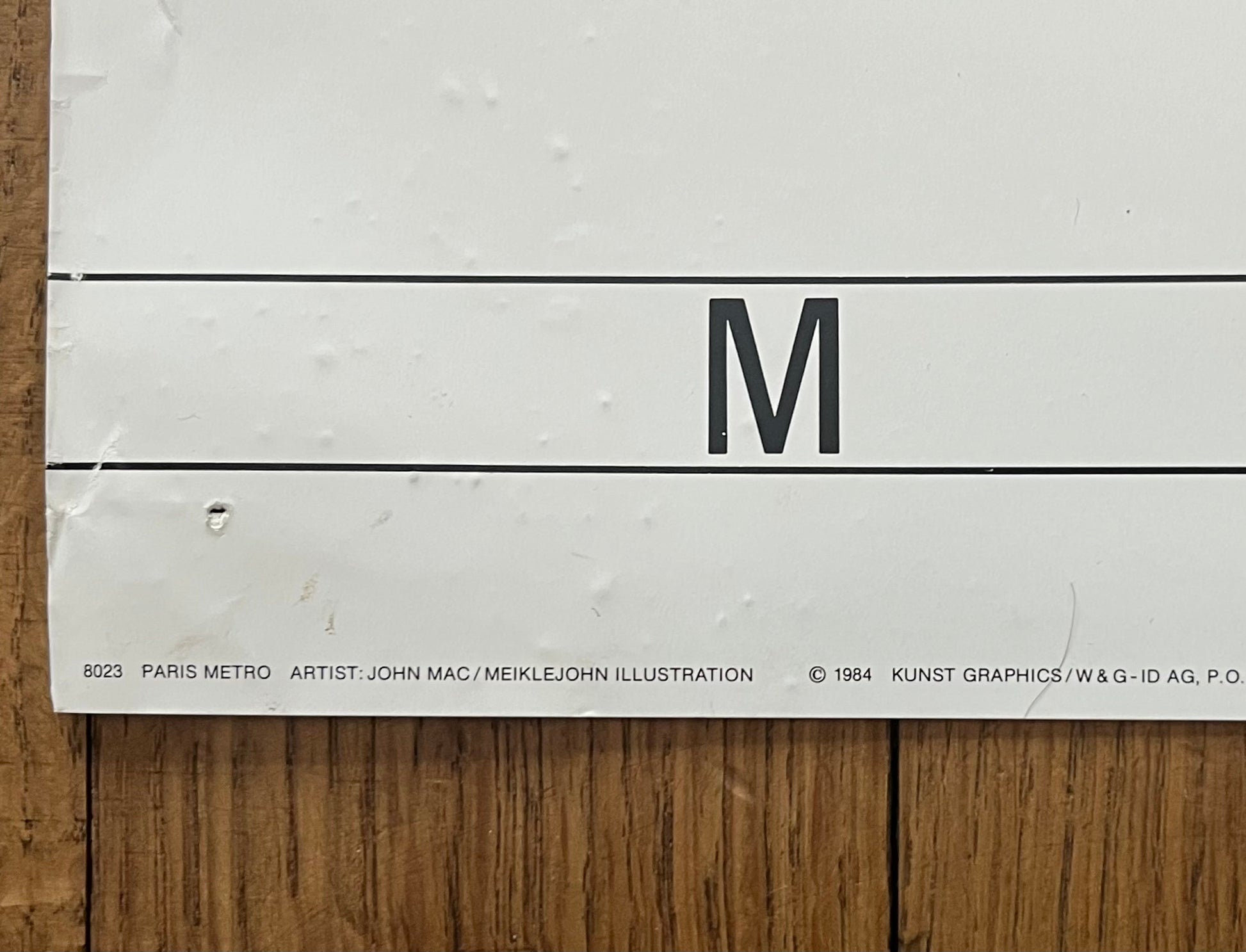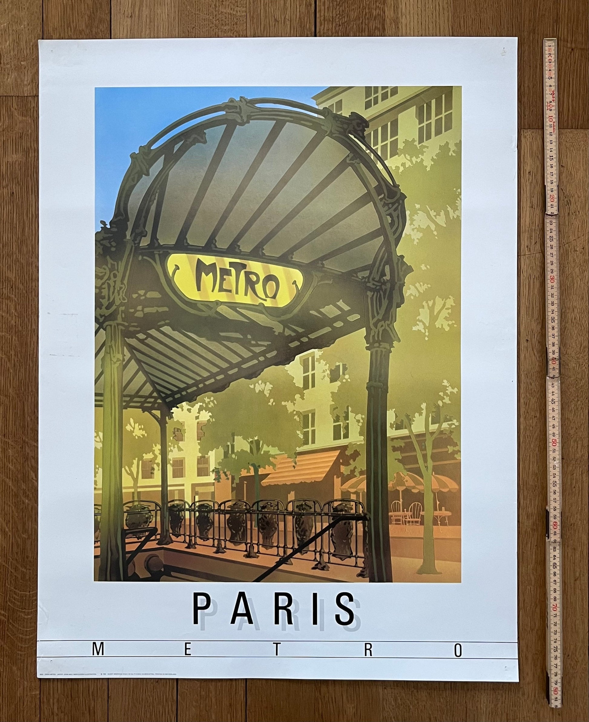 This is an original art poster called Paris Metro was illustrated in 1984 by the illustrator John Mac. The poster was released by Meiklejohn Illustrations, which is a British company that represents illustrators like John Mac.