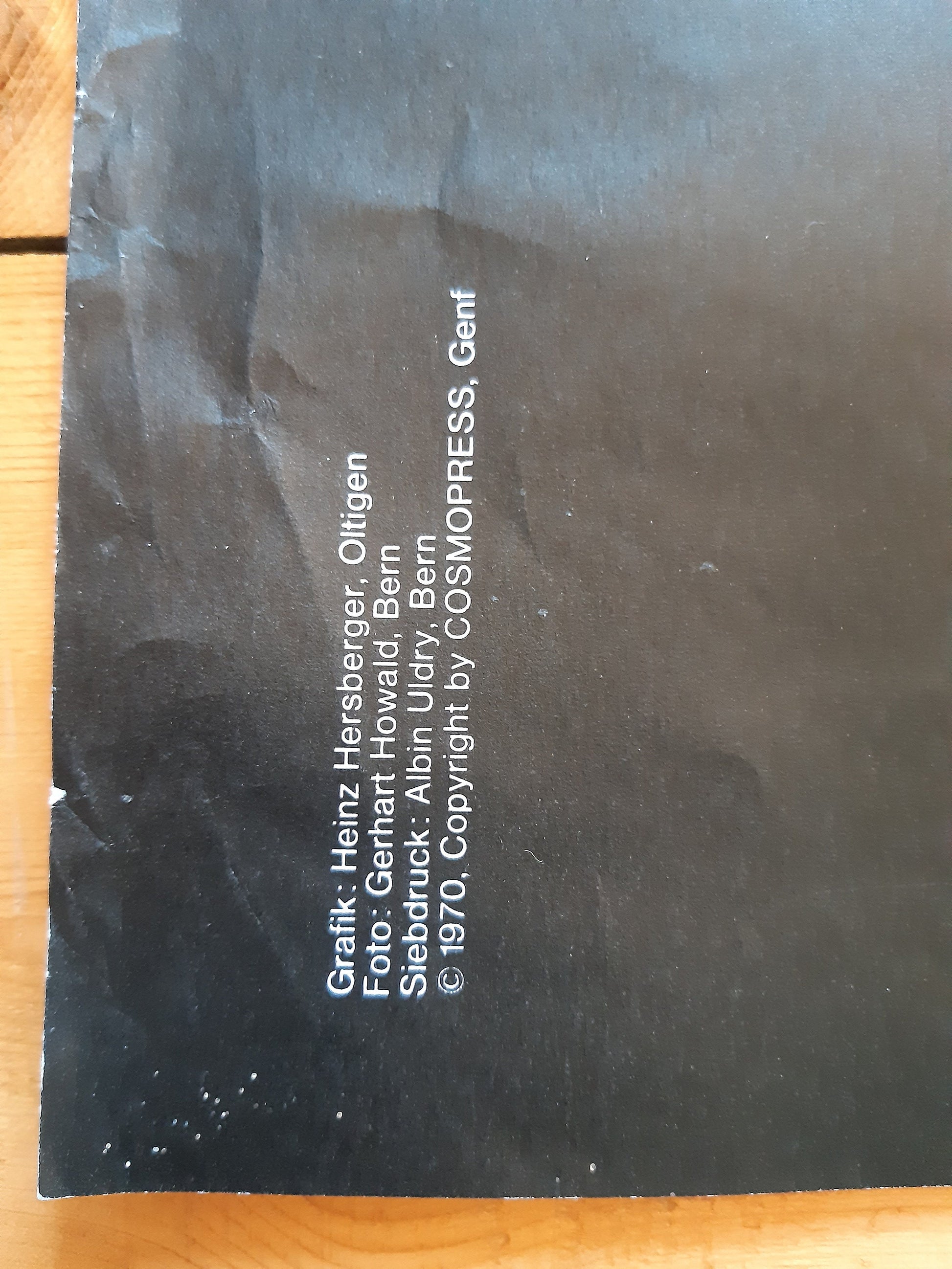 The poster is a serigraph printed in 1970 by Uldry in Berne. It is in used condition with some signs of handling, one very tiny tear at the border and a hole at the top (but no paper missing).