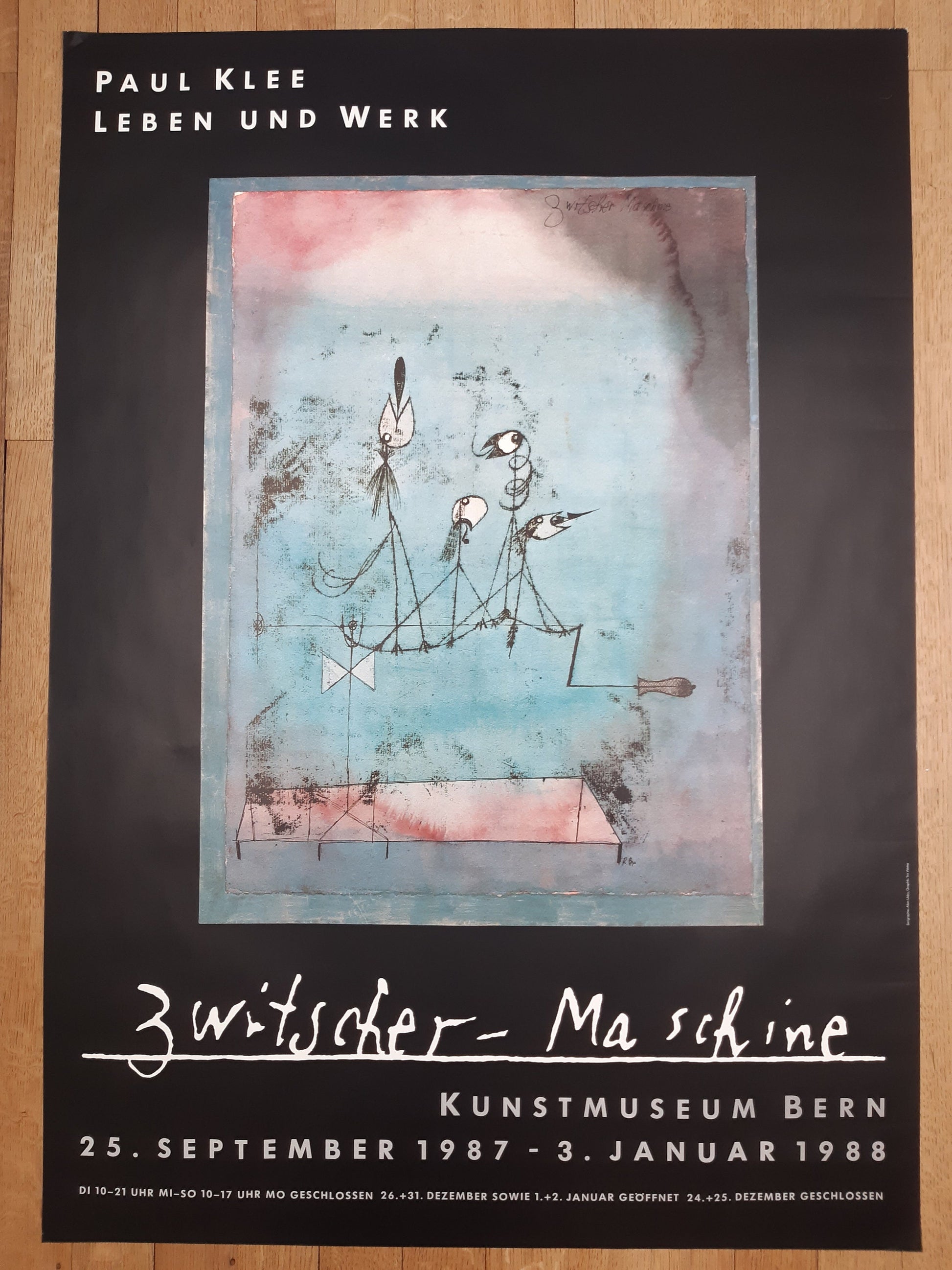 This large original poster has been designed to advertise an exhibition at the the Kunstmuseum in Bern, Switzerland. It features the artwork "Zwitscher-Maschine", painted by Paul Klee.