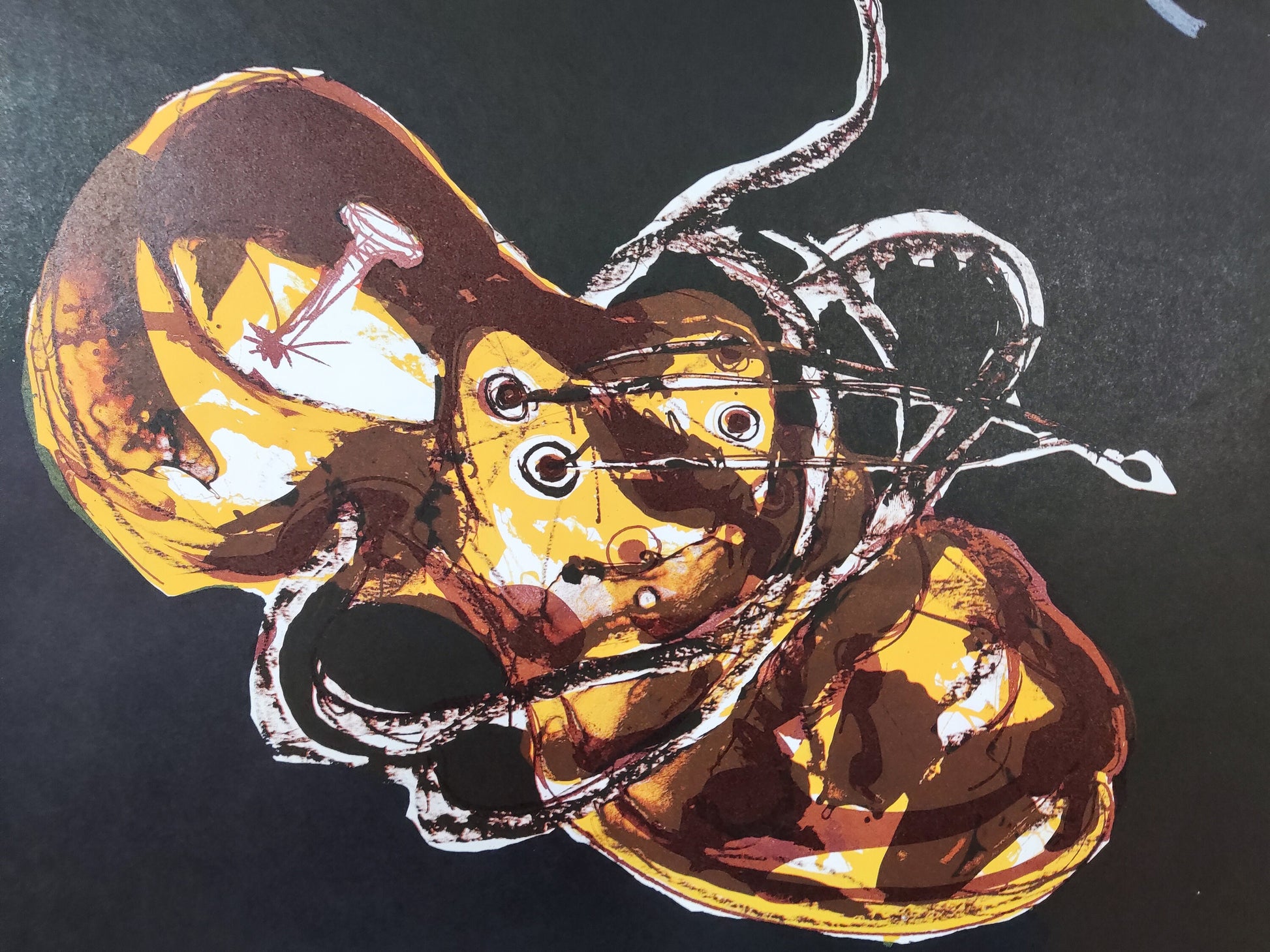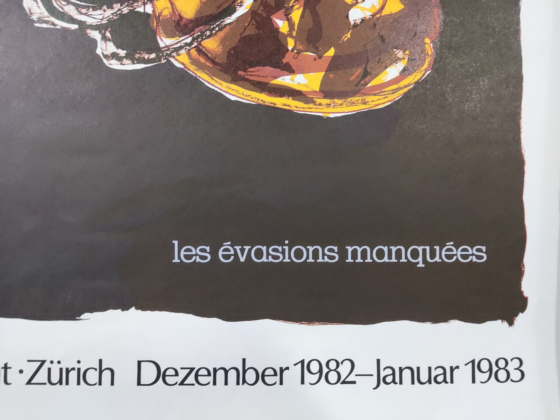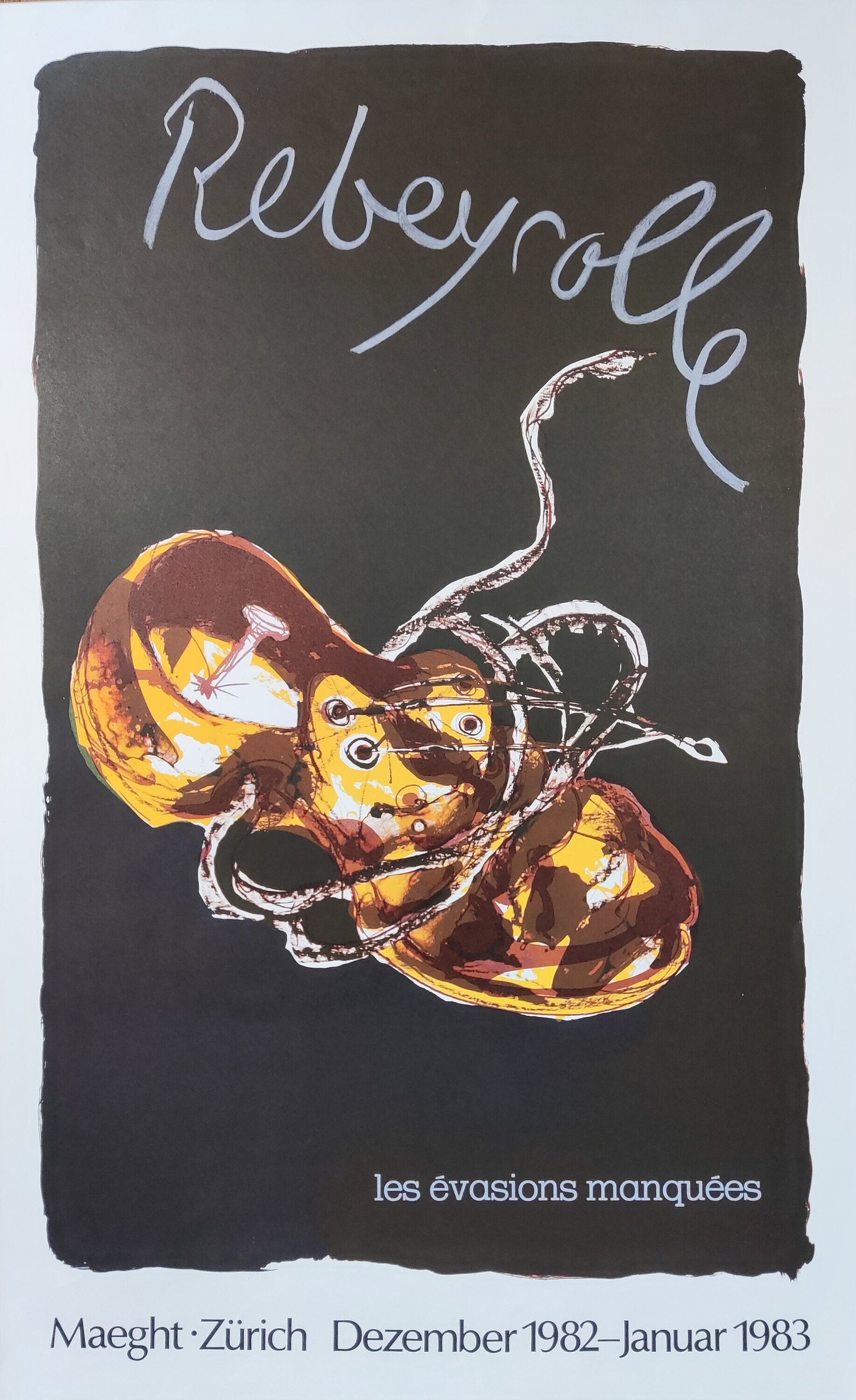 This is an original litho art poster by french Paul Rebeyrolle featuring a work of a violin and advertising an exhibition at the Gallerie Maeght in Zurich in 1982-83.