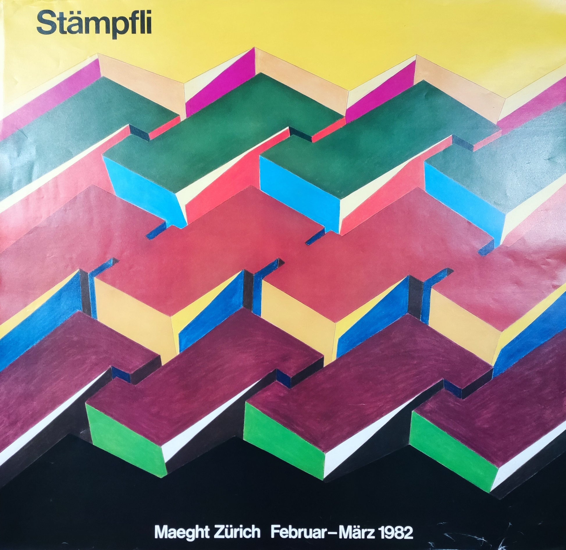 This is an original art poster by swiss Peter Stämpfli featuring an abstract colorful artwork and advertising an exhibition at the Gallerie Maeght in Zurich in 1982.