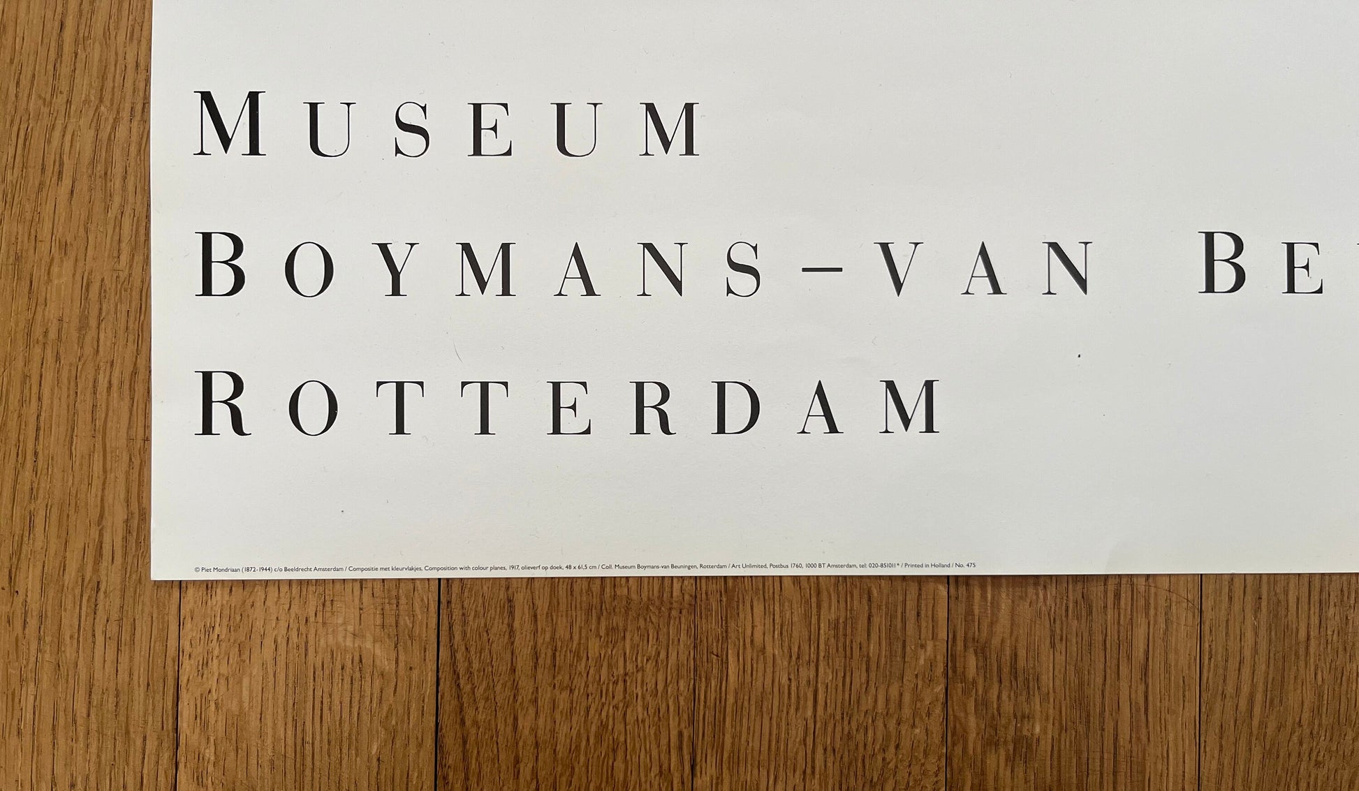 This is an original art poster by Piet Mondrian entitled "Composition with colour planes" for an exhibition at the Coll. Museum Boymans-van in Rotterdam in 1988. The poster is in a good condition with some light folds on the upper border.