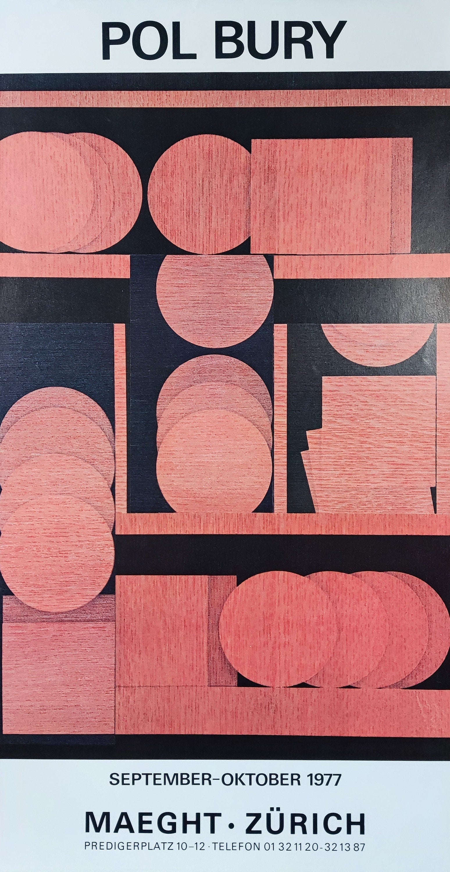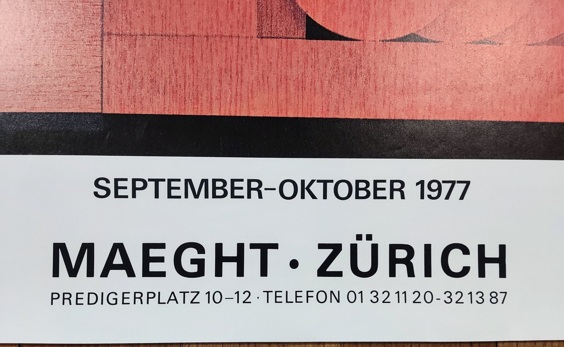 Beautiful art poster by belgian Pol Bury featuring an artwork with abstract red and black objects and advertising an exhibition at the Gallerie Maeght in Zurich in 1977.