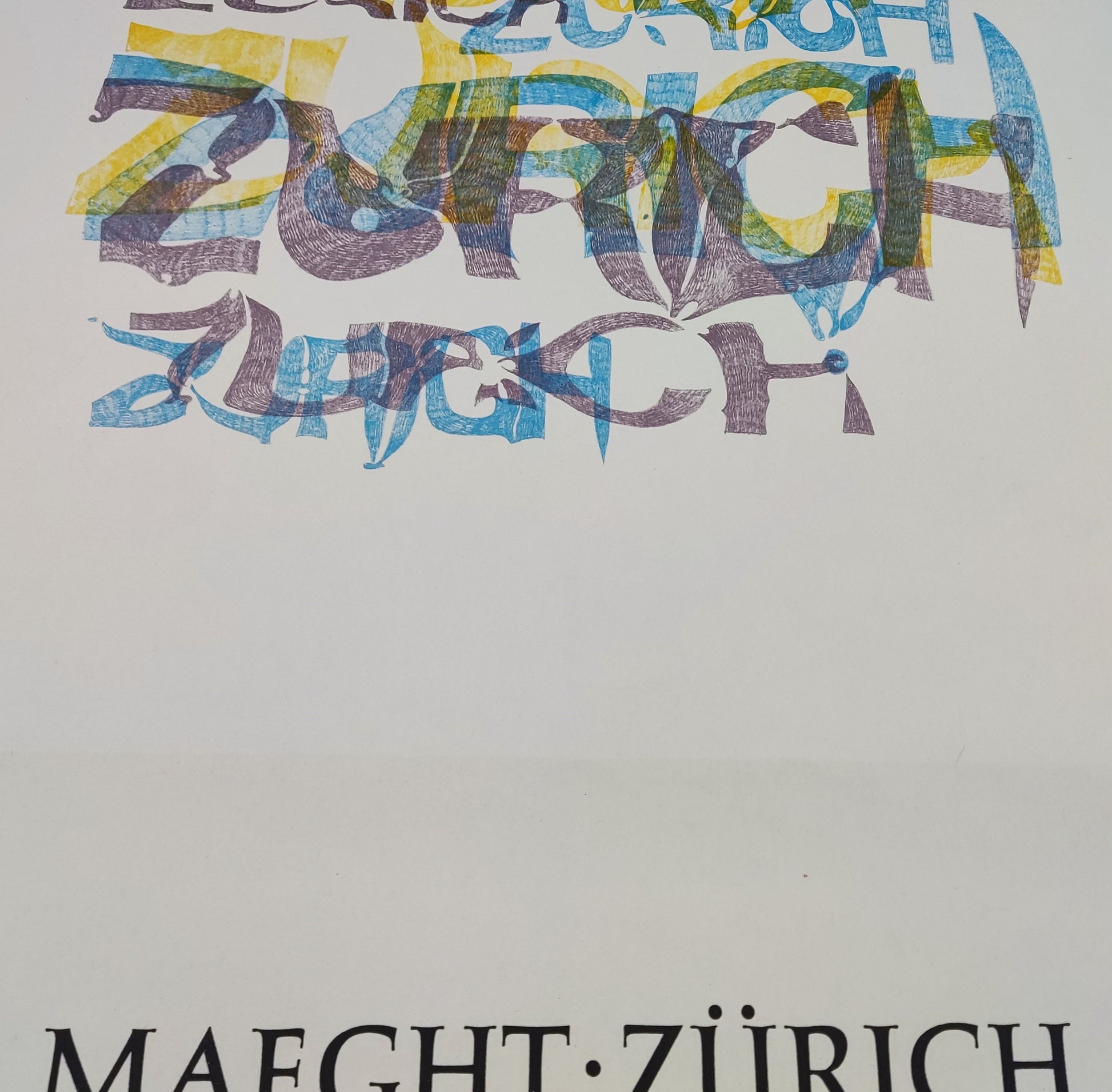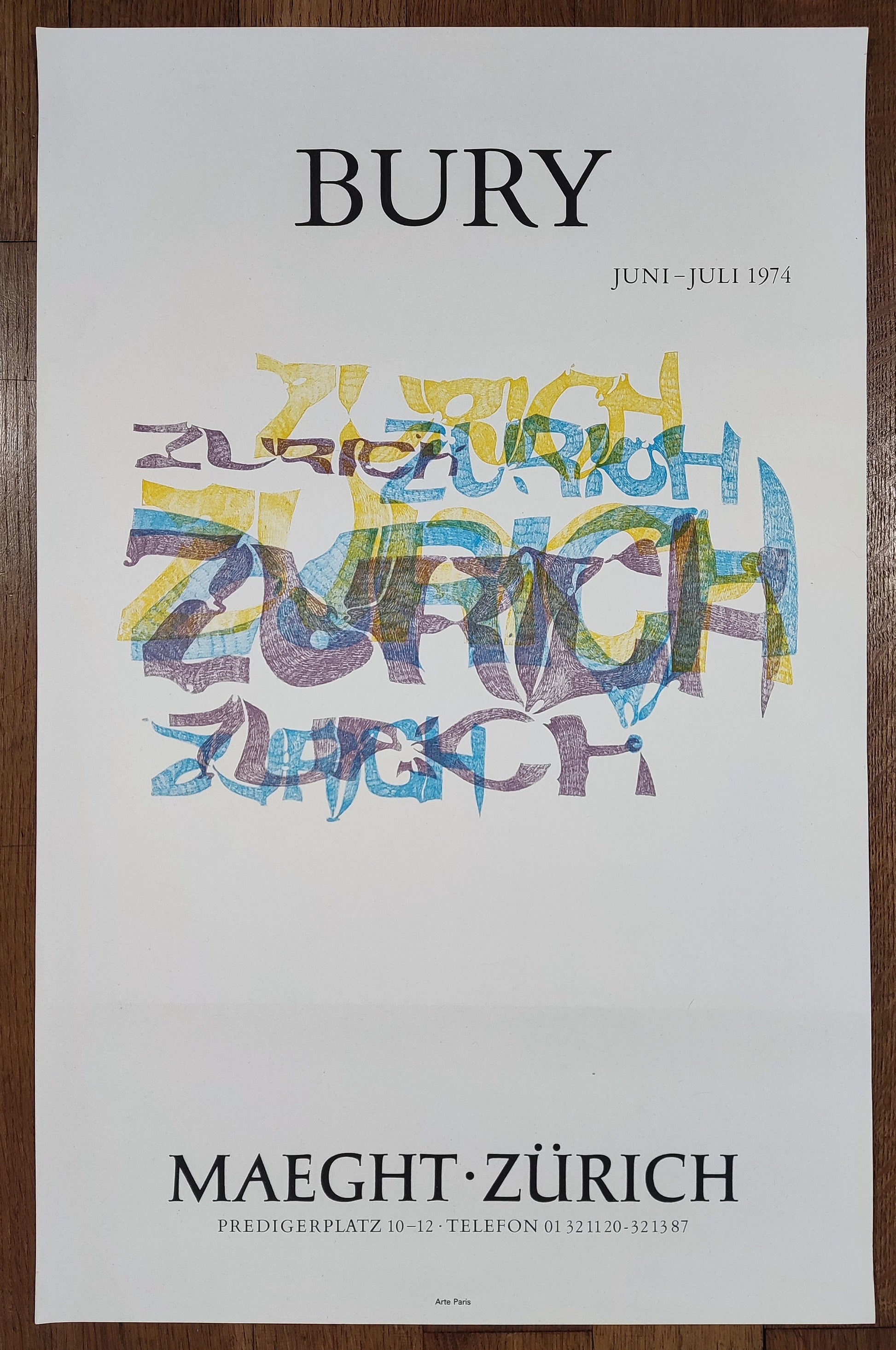 This is an original art poster by Pol Bury featuring a "Zurich"-Artwork and advertising an exhibition at the Galerie Maeght in Zurich in 1974.