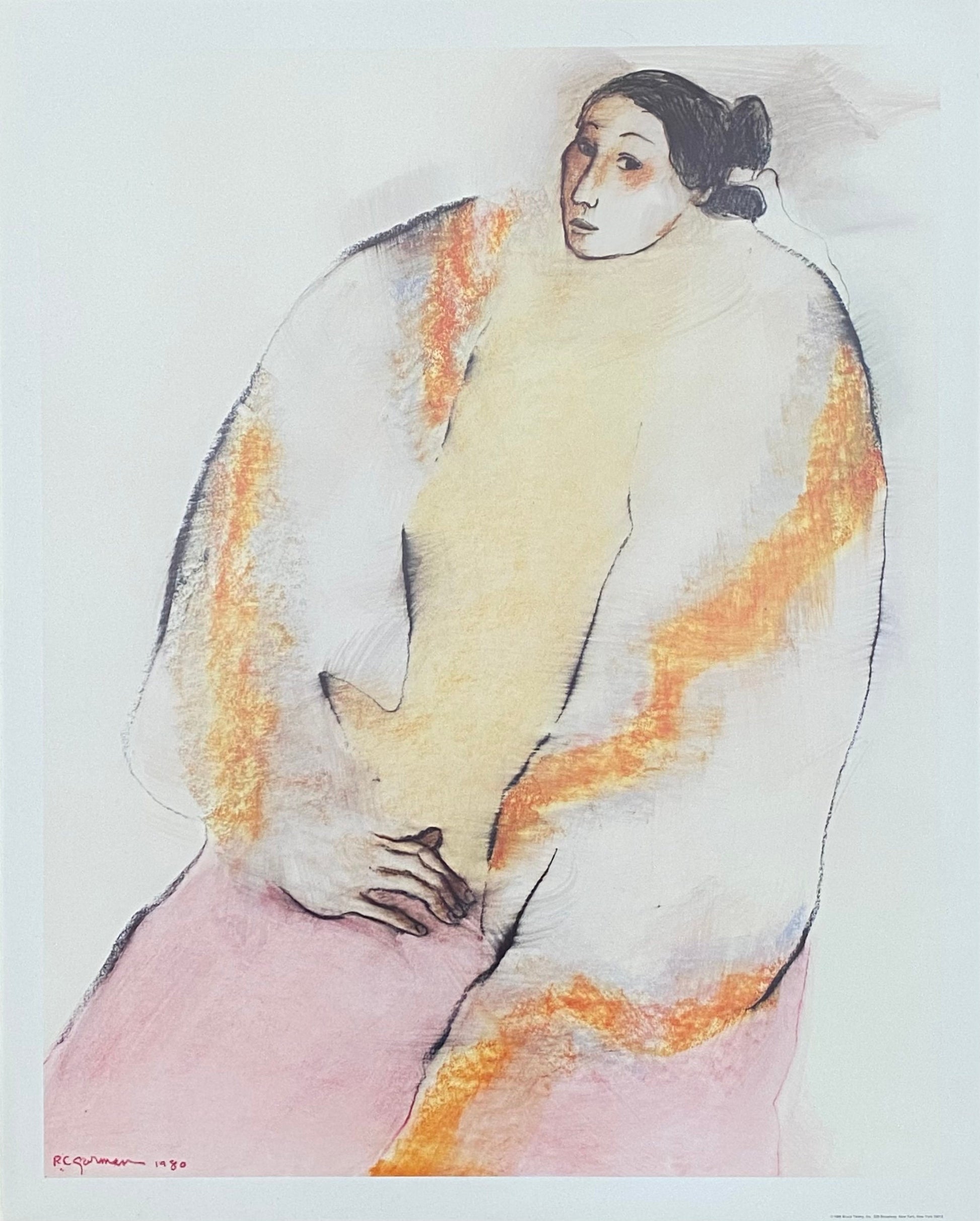 This is an original art poster featuring an artwork by American R.C. Gorman with a woman sitting and looking towards the observer.