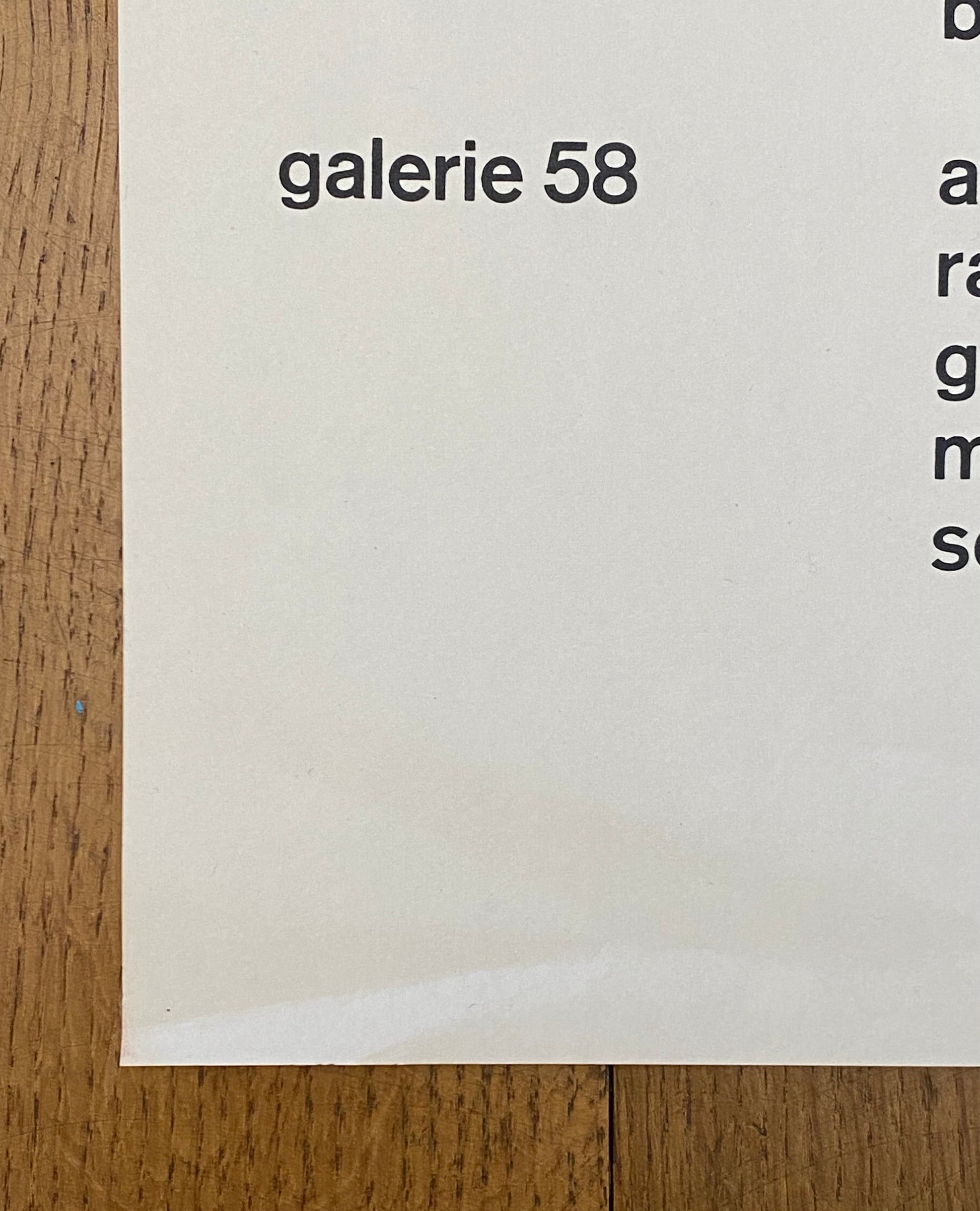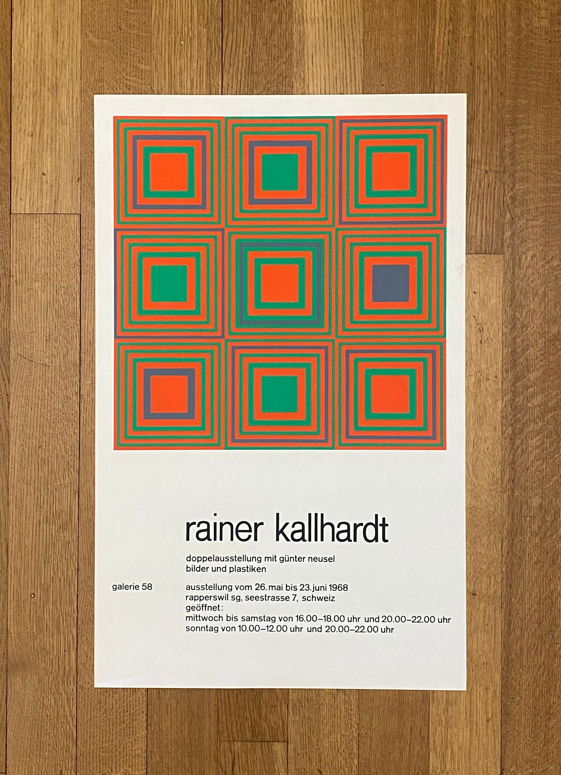 This is a beautiful silkscreen-lithography art poster by Reiner Kallhardt featuring an artwork with colorful squares and advertising an exhibition at the "Galerie 58" in Switzerland in 1968.