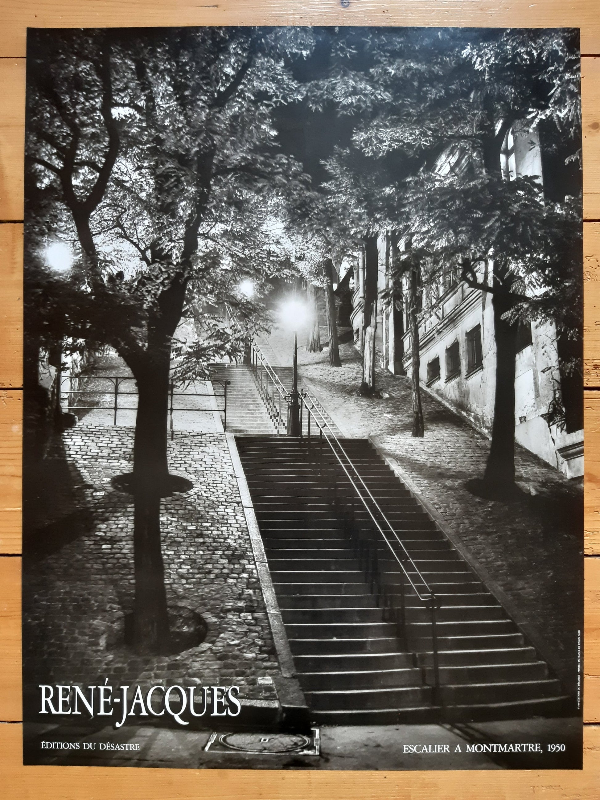 This is a beautiful vintage photo poster with the artwork "Escalier a Montmartre", taken 1950 by René-Jacques. The poster has been produced by Editions du Désastre in 1989. It is in very good condition.