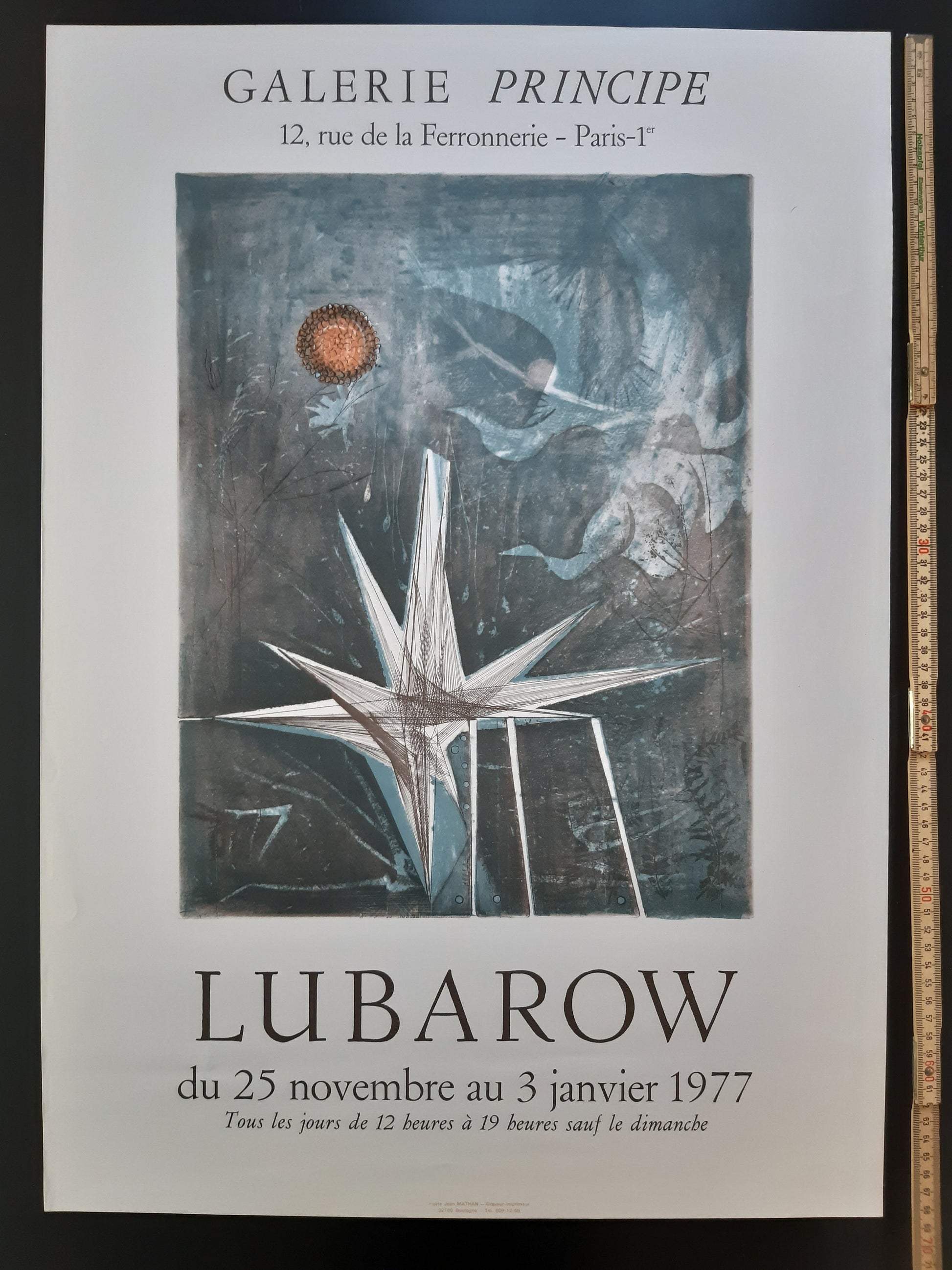 This is an original vintage art poster advertising an exhibition at Galerie Principe in Paris in 1977. It features a water color painting of Renée Lubarow, a french painter (born 1923)