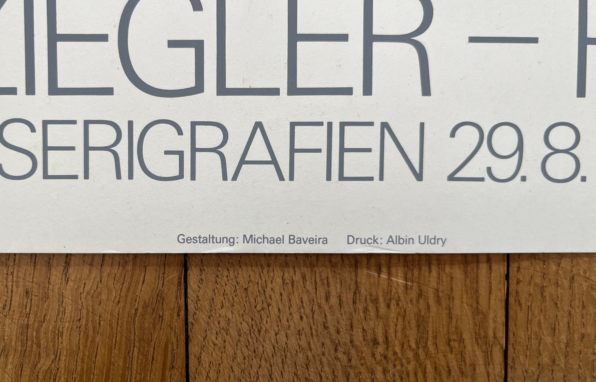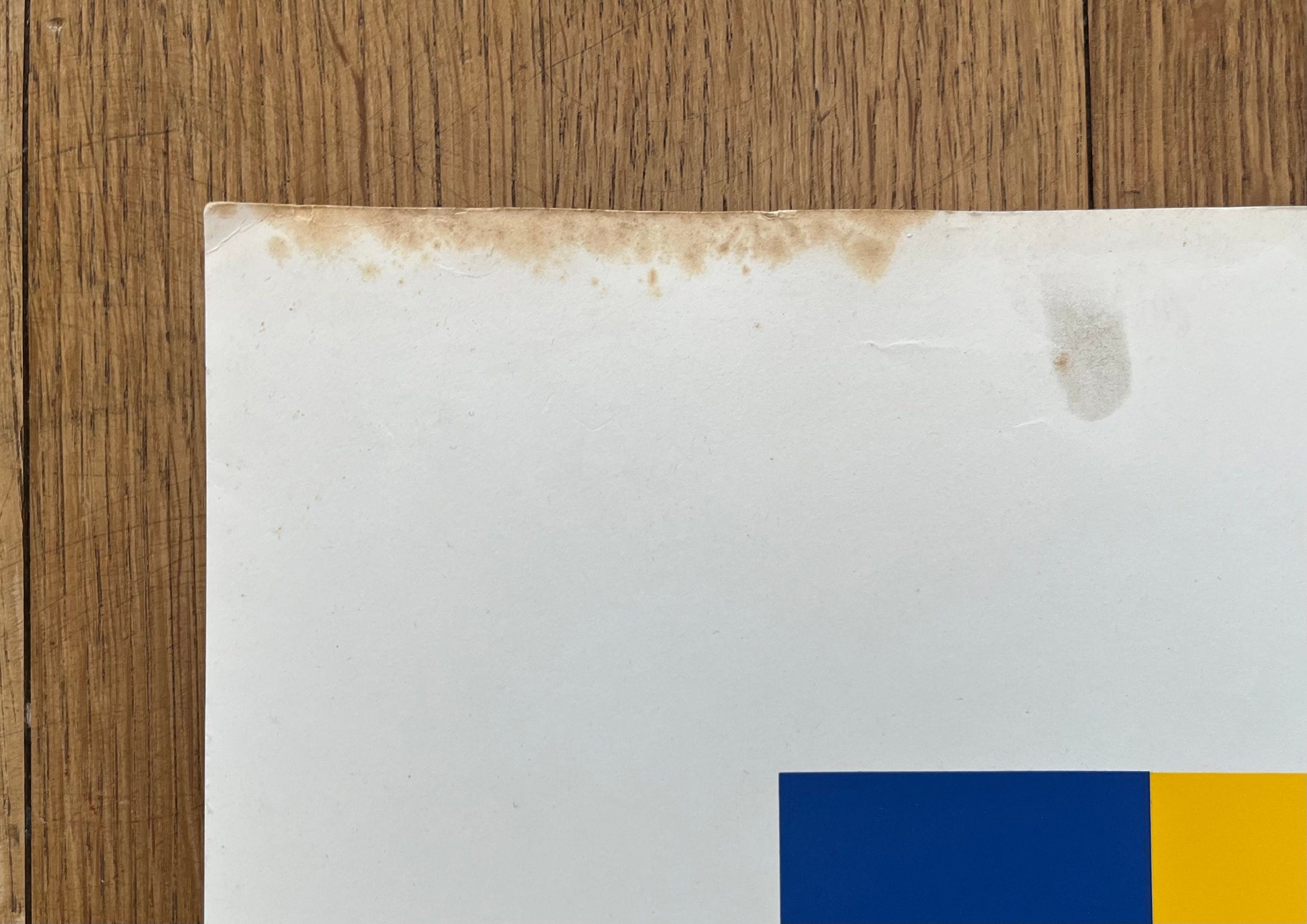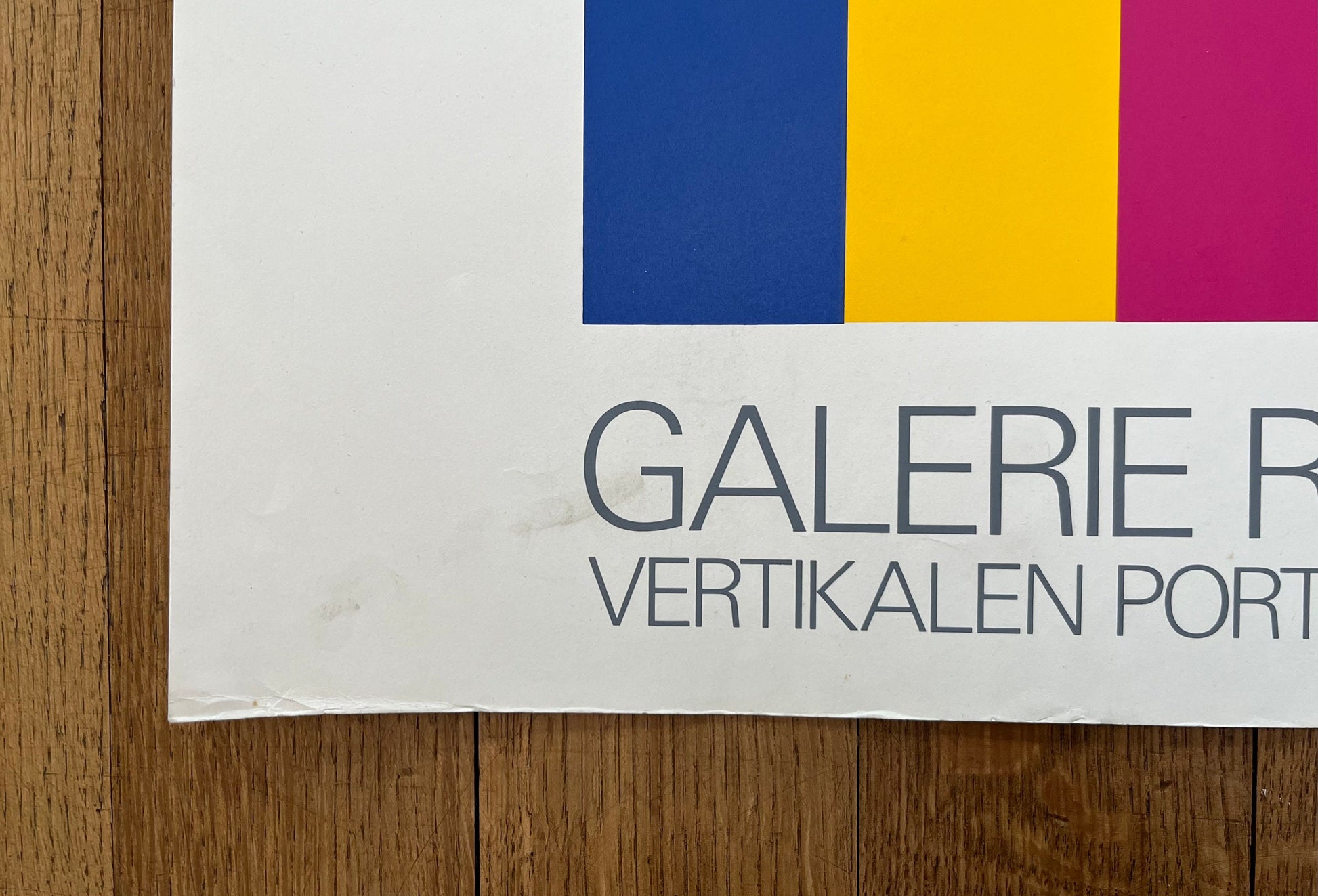 This is an original silkscreen art poster featuring a work by Richard Paul Lohse and advertising an exhibition at the Galerie Renée Ziegler in Zurich in 1970. The poster is in used condition with signs of handling along the borders, a dog-ear and stains at the top left corner.