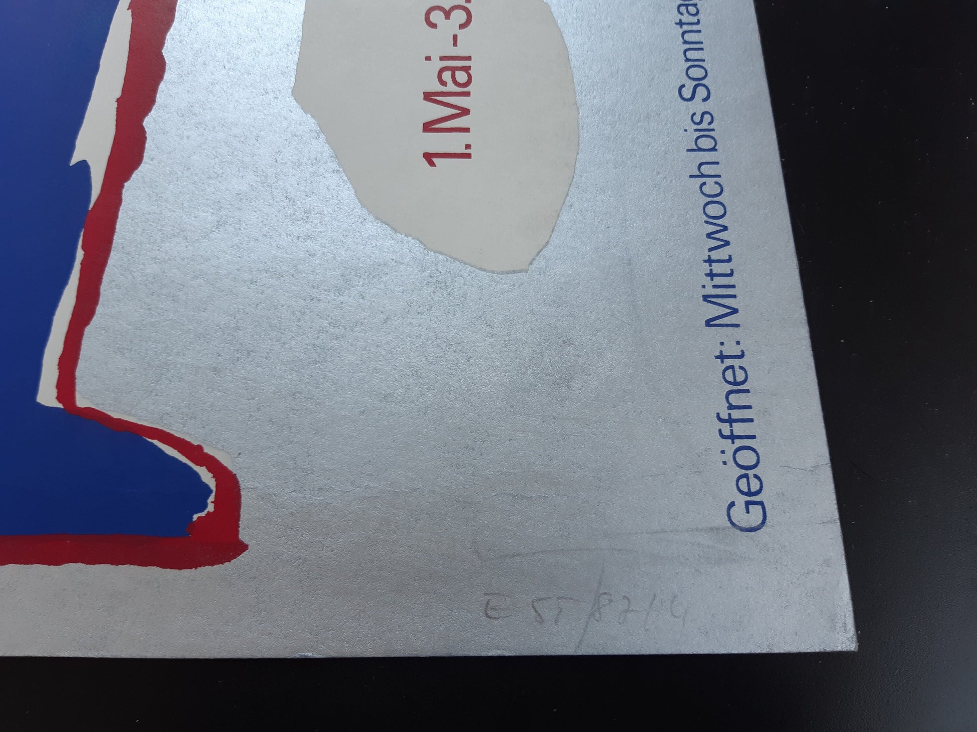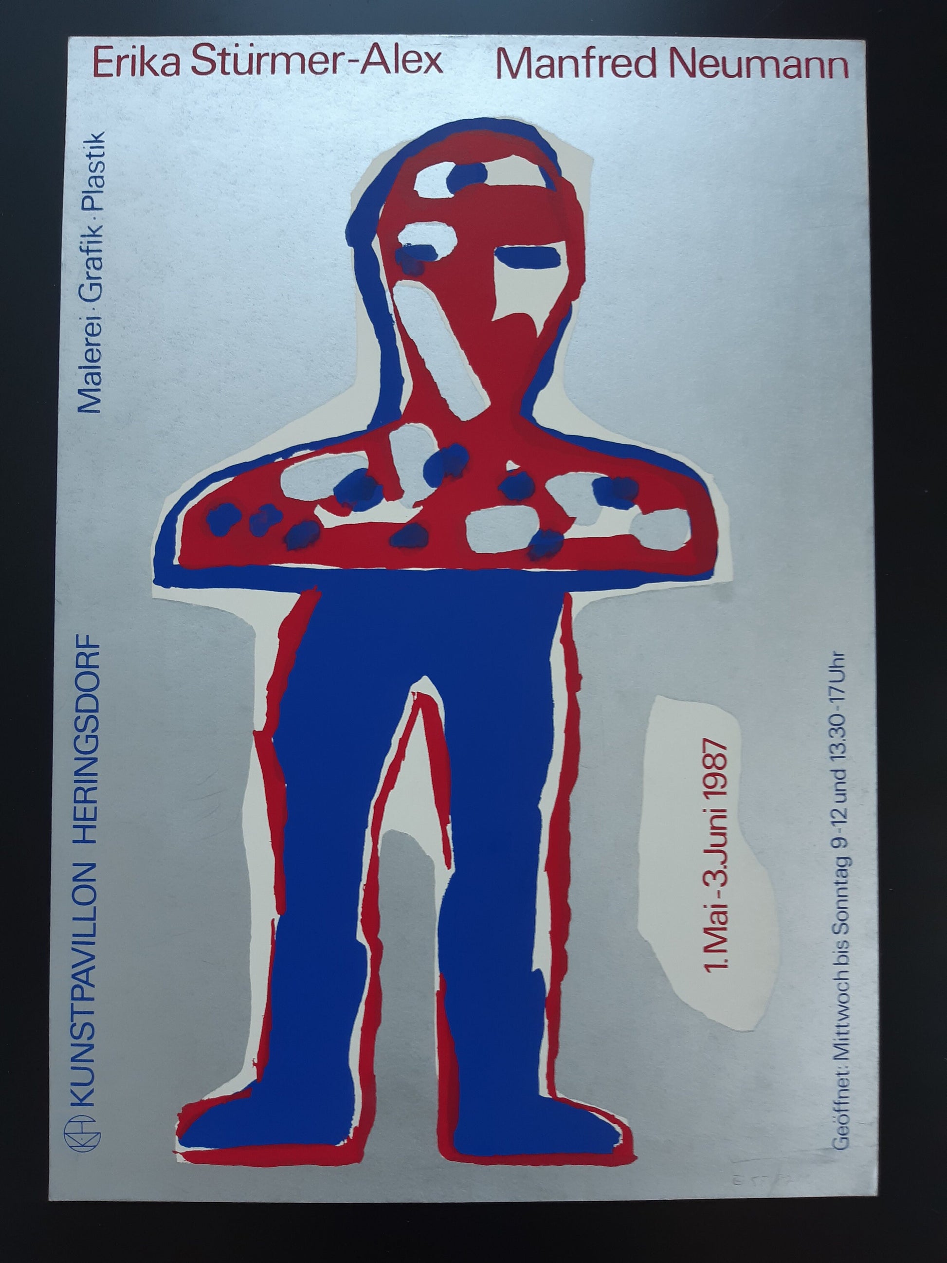 This very special, small poster advertises an exhibition of Erika Stürmer-Alex (born 1938) and Manfred Neumann (born 1938), both German painters, at the Kustpalivvon Heringsdorf, Germany. It has been printed in 1987 as a silkscreen onto silver paper. The poster has some signs of handling. It is hand signed (monogrammed) in the lower right edge.