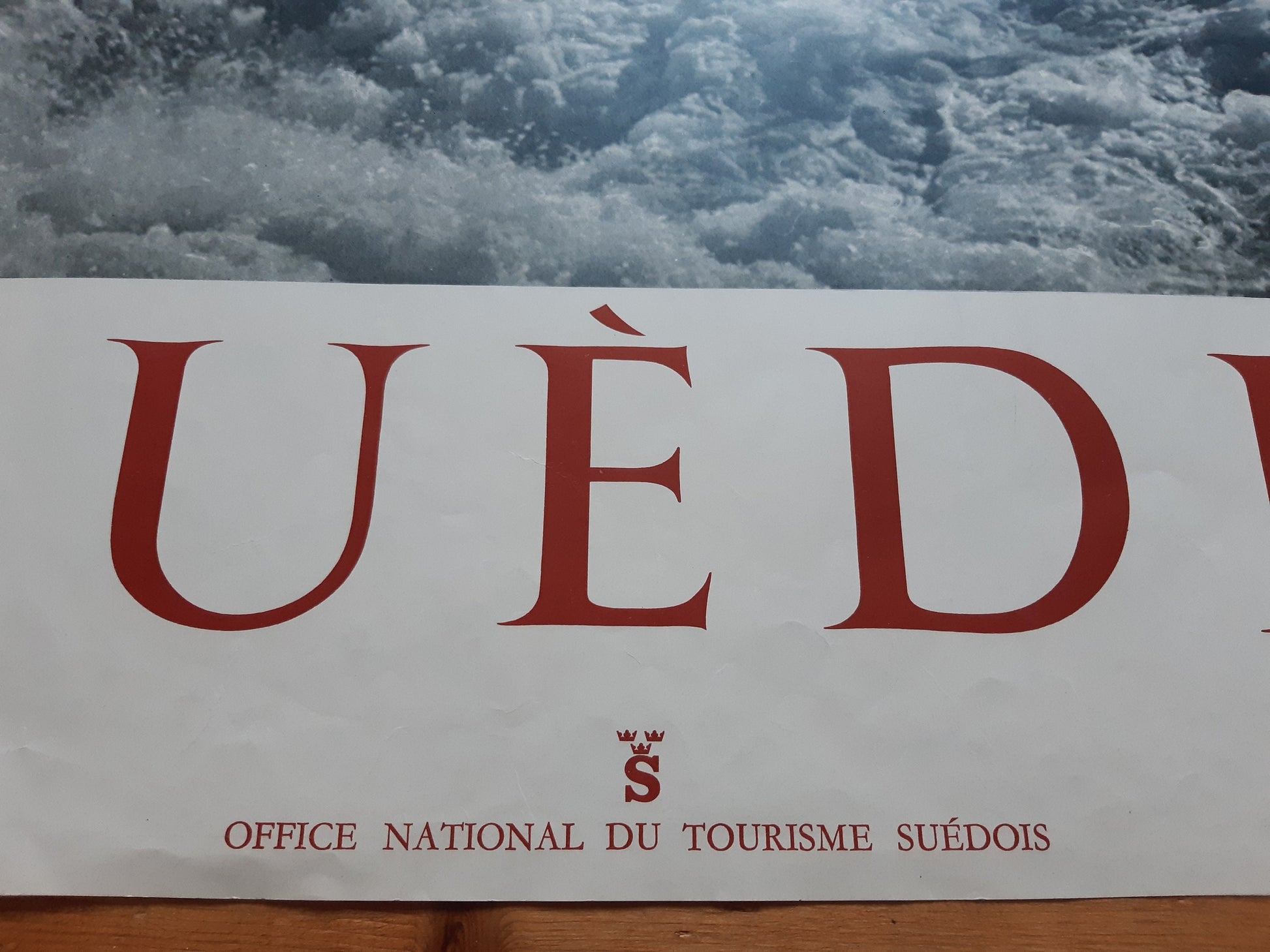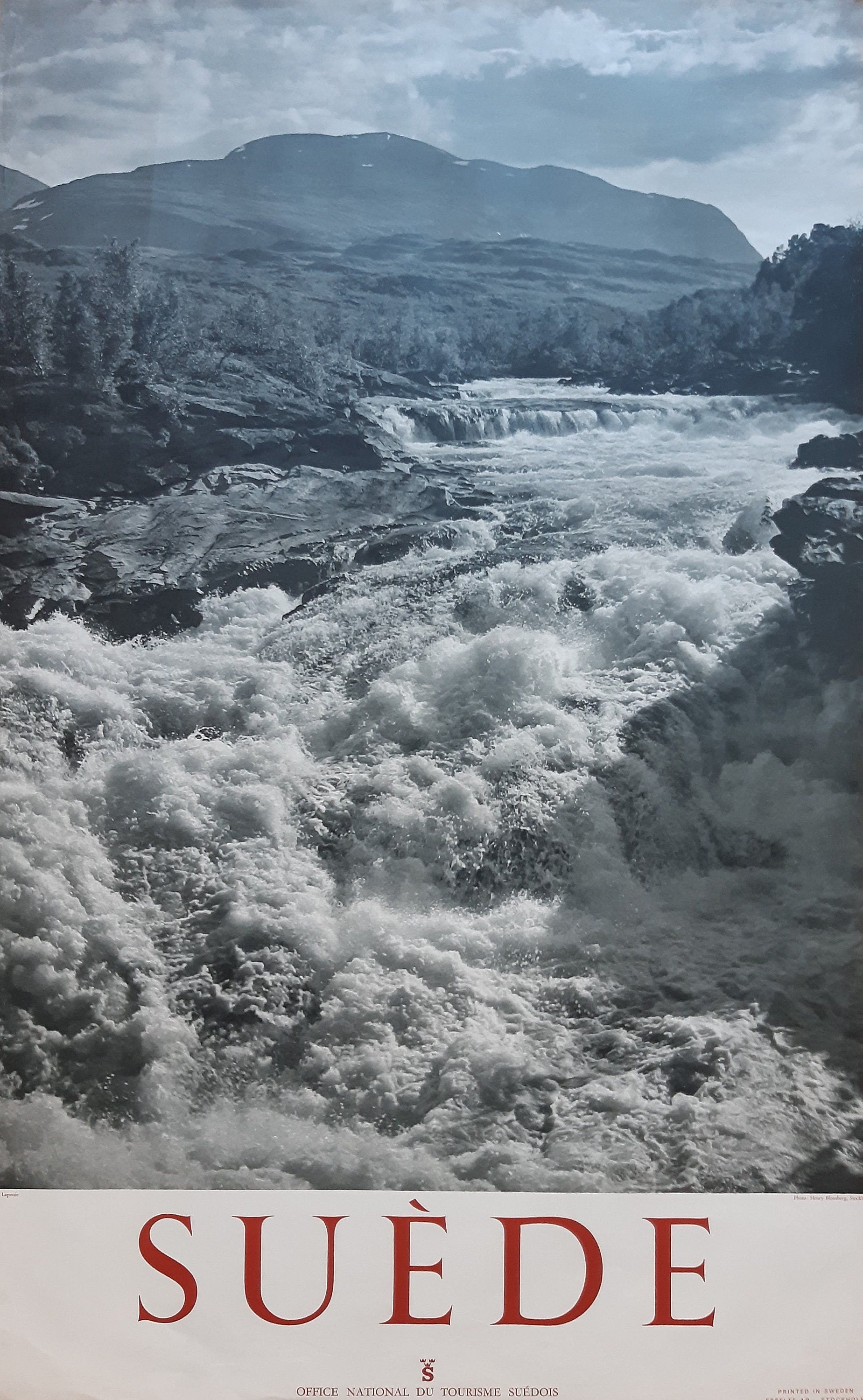 This poster has been designed to advertise tourism to Sweden. It shows a photo of a waterfall in Abisko in northern Sweden (lapland)