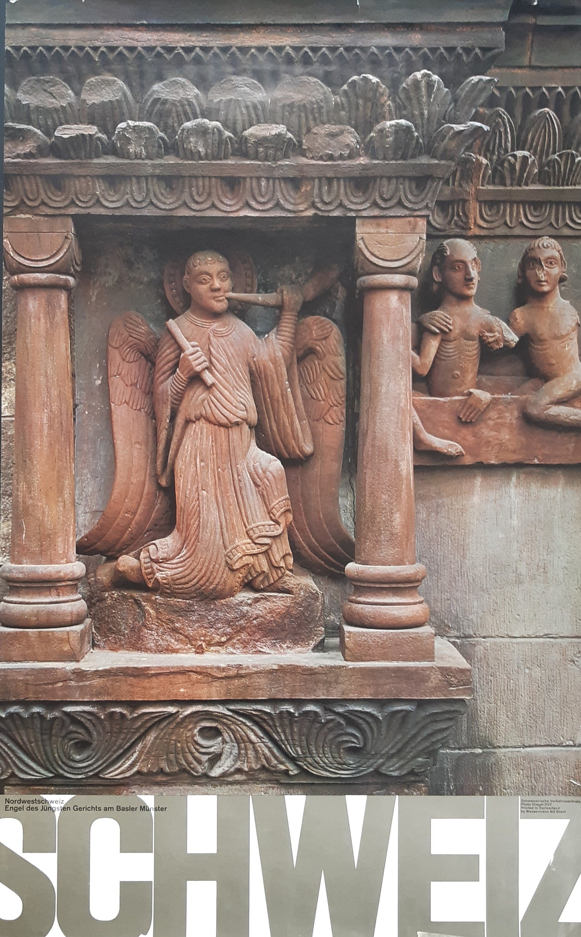This original poster has been designed to advertise travelling to Switzerland. It shows a photo of figurative sculpture that can be seen at the walls of the large church in Basel.