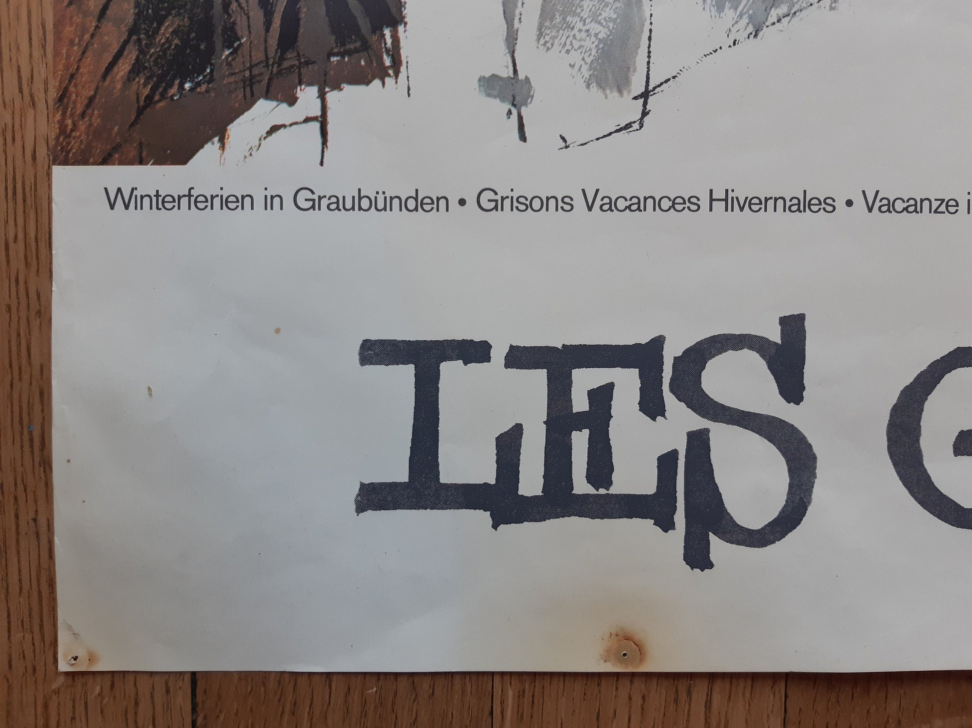 This is an original Swiss travel poster to advertise winter tourism in the Canton Grisons in eastern Switzerland. It is undated but may be at least 60 years old. It is in used condition with several flaws as photographed.