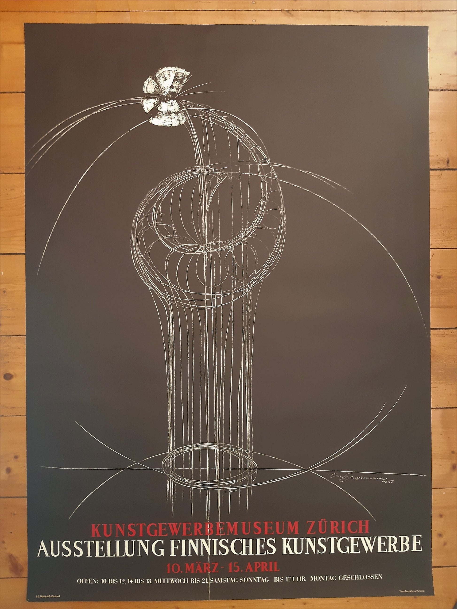 This is an original art poster with an artwork of Timo Sarpaneva (Finnland, 1926-2006). The exhibition took place at the Kunstgewerbemuseum in Zürich, Switzerland in 1951.