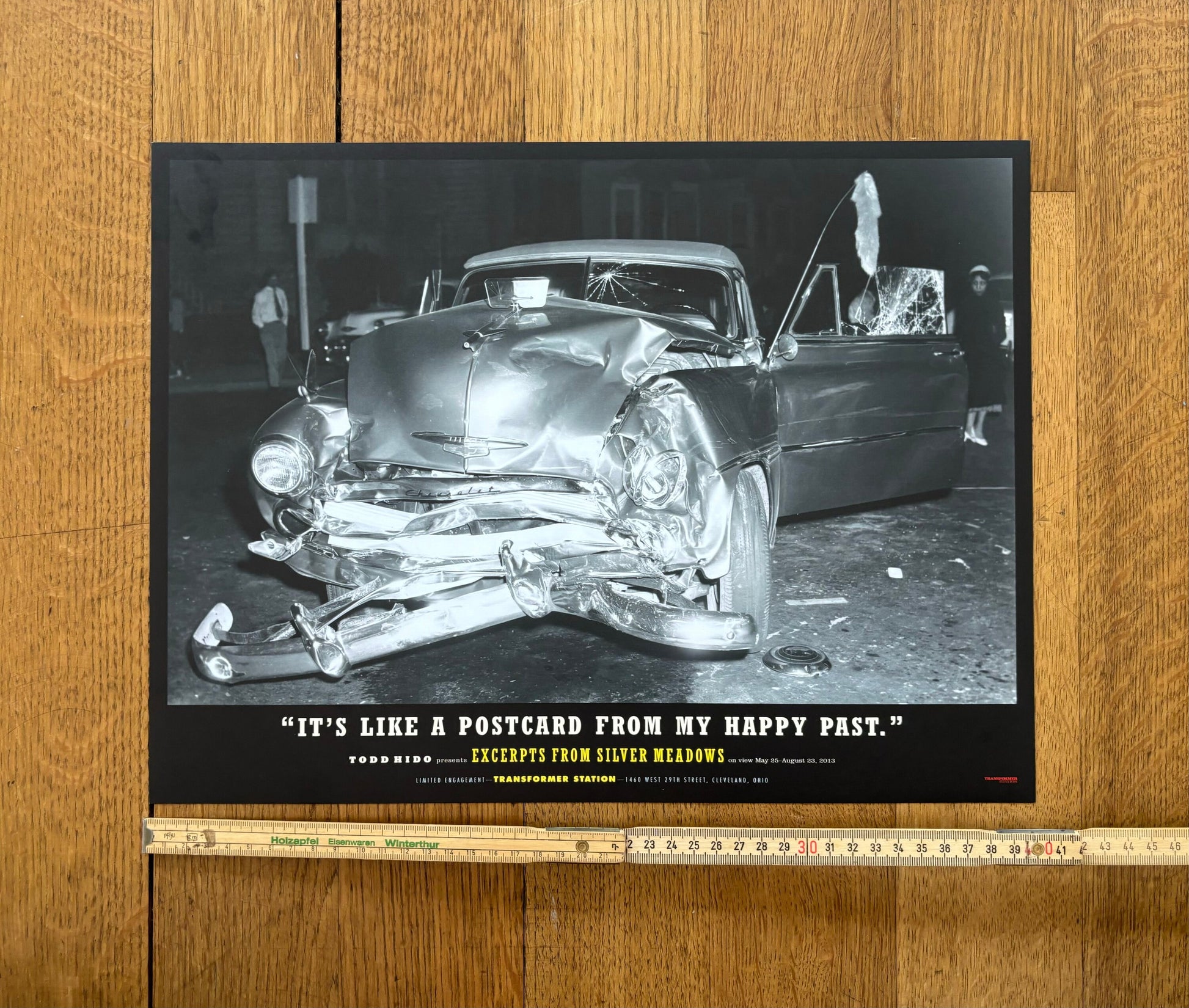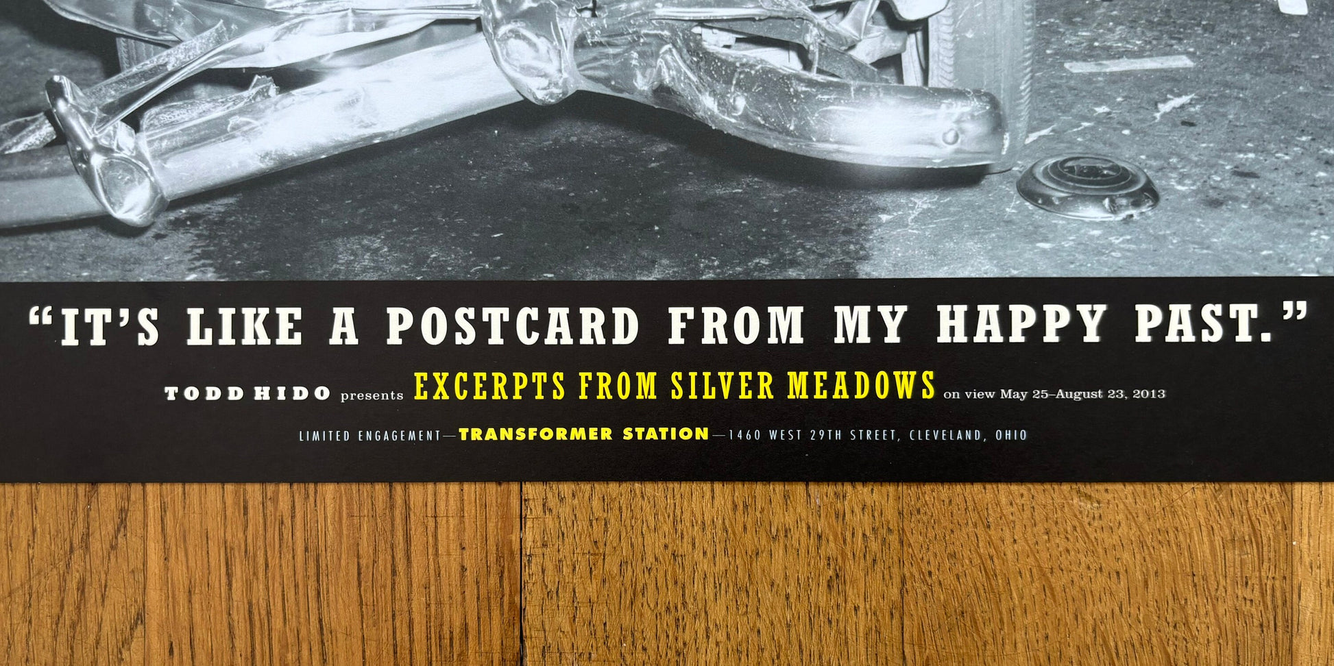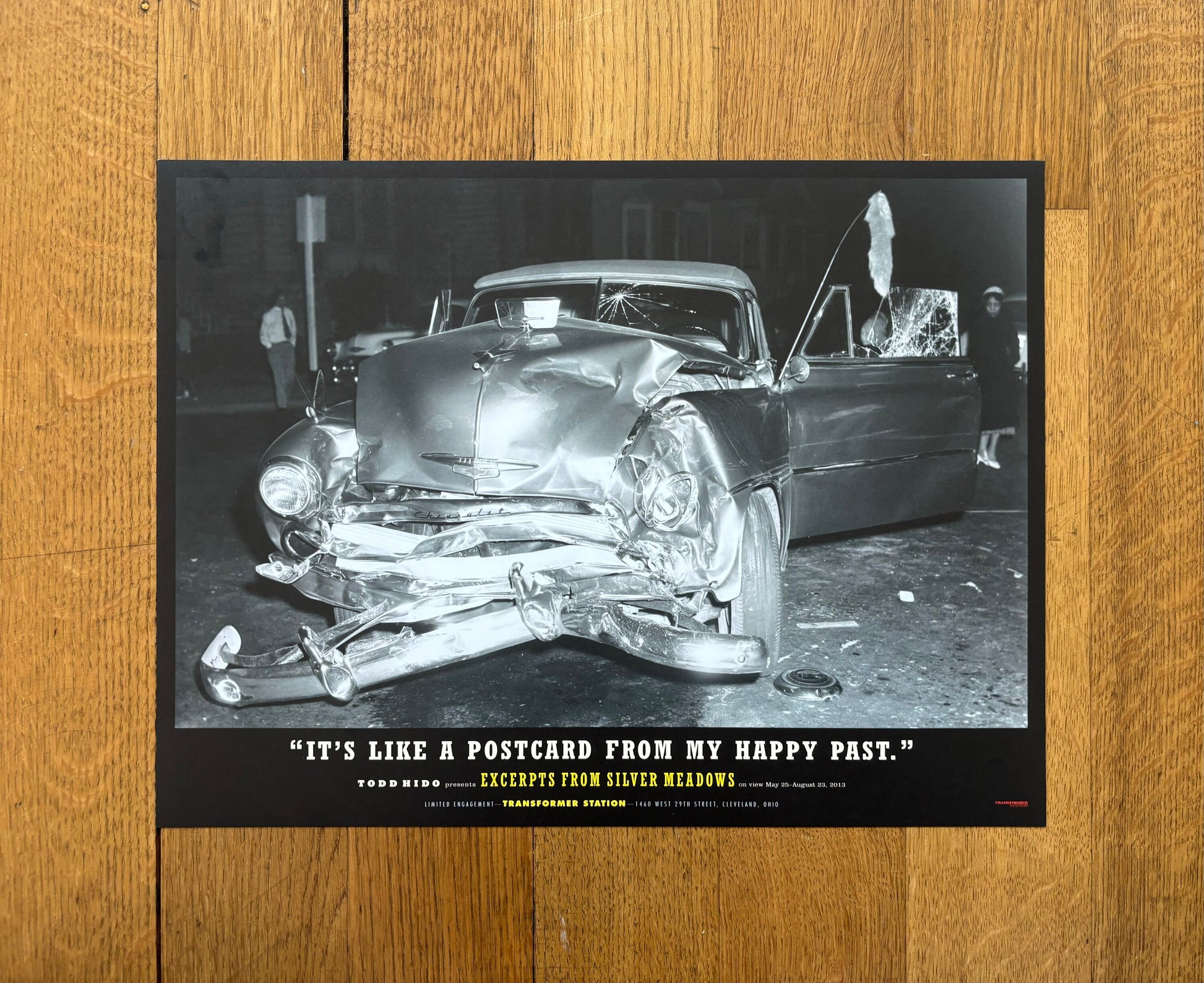 This is a beautiful photography poster by the famous Todd Hido featuring an artwork of a car with a smashed front end. At the bottom of the poster is a lettering which says: "It's like a postcard from my happy past". The poster advertises the exhibition of Hido's book "Excerpts From Silver Meadows" in 2013.
