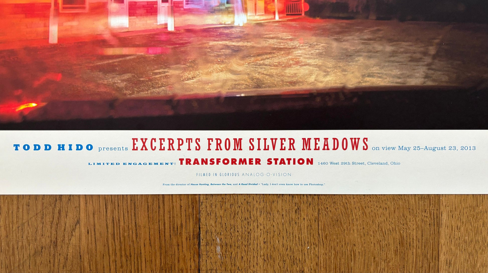 This is an original photography poster by the American Todd Hido featuring an artwork of a white house which is illuminated by colorful lights and surrounded by trees. The poster advertises the exhibition of Hido's book "Excerpts From Silver Meadows" in 2013.